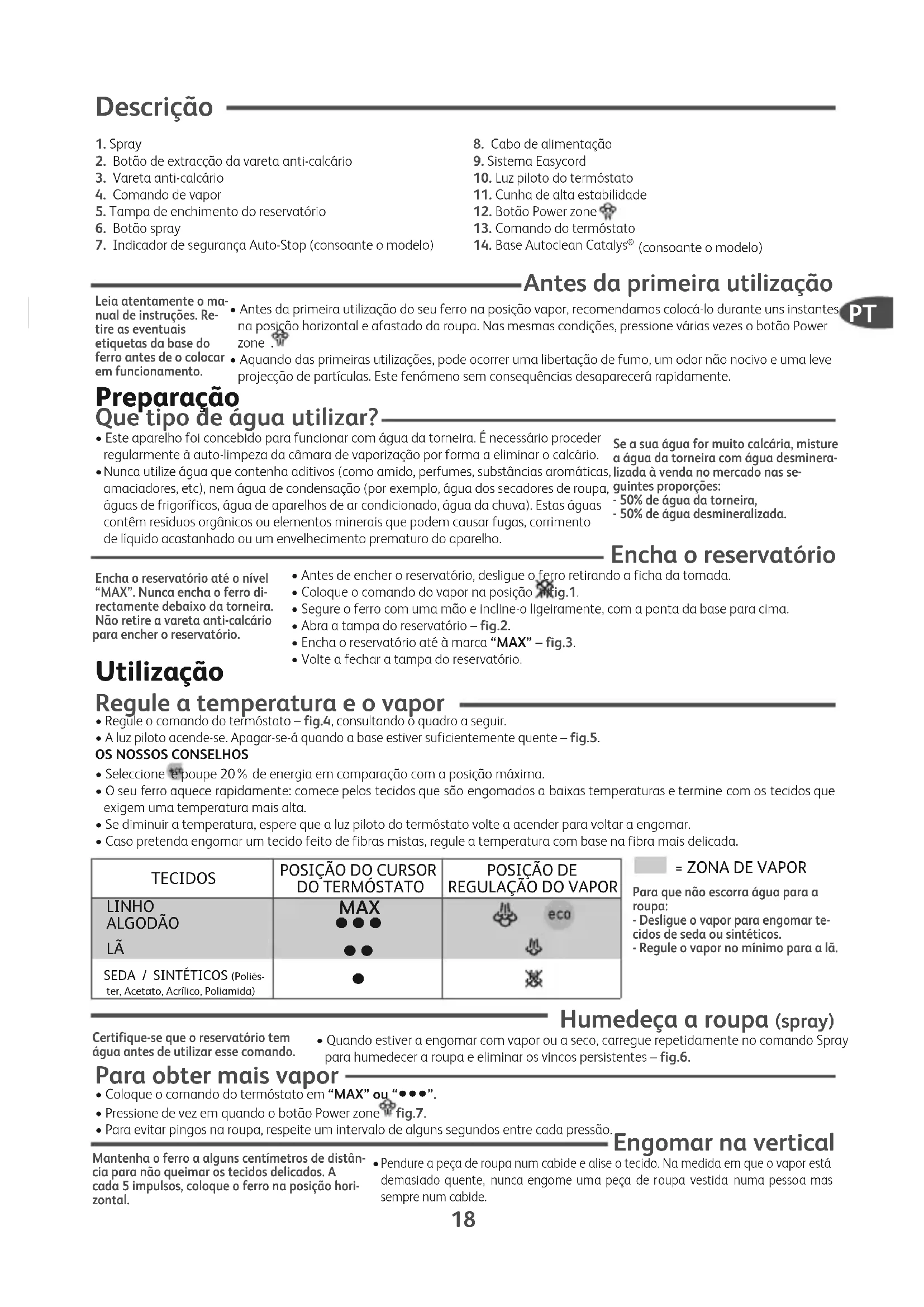 1800132812FV53XXE0A11_110x15403/03/1409:37Page17Descrição 1. Spray2. Botão de extracção da vareta anti-calcário3. Vareta anti-calcário4. Comando de vapor5. Tampa de enchimento do reservatório6. Botão spray7. Indicador de segurança Auto-Stop (consoante o modelo)8. Cabo de alimentação9. Sistema Easycord10. Luz piloto do termóstato11. Cunha de alta estabilidade12. Botão Power zone 13. Comando do termóstato14. Base Autoclean Catalys (consoante o modelo) Antes da primeira utilização