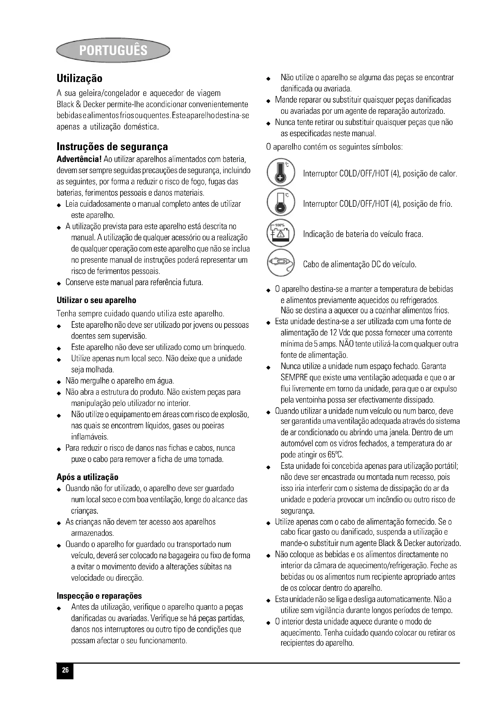 Utilize apenas com o cabo de alimentação fornecido. Se o cabo ficar gasto ou danificado, suspenda a utilização e mande-o substituir num agente Black & Decker autorizado. - Não coloque as bebidas e os alimentos directamente no interior da câmara de aquecimento/refrigeração. Feche as bebidas ou os alimentos num recipiente apropriado antes de os colocar dentro do aparelho.