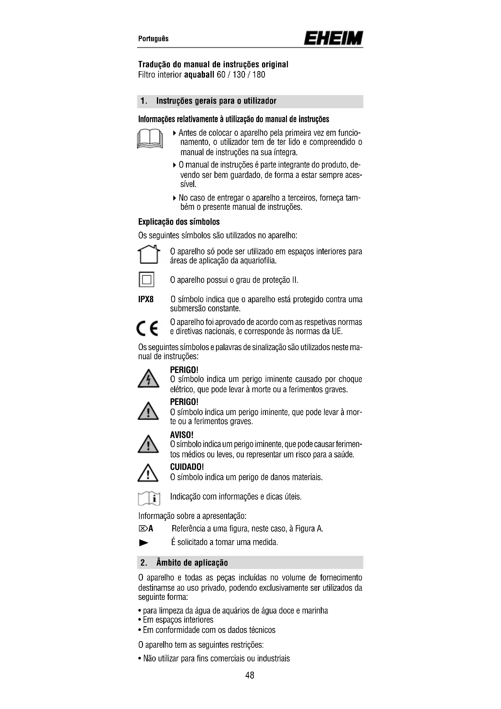 4 Antes de colocar o aparelho pela primeira vez em funcio- namento, o utilizador tem de ter lido e compreendido o manual de instruções na sua íntegra. 4 O manual de instruções é parte integrante do produto, de- vendo ser bem guardado, de forma a estar sempre aces- sível. 4 No caso de entregar o aparelho a terceiros, forneça tam- bém o presente manual de instruções. Explicação dos símbolos Os seguintes símbolos são utilizados no aparelho: O aparelho só pode ser utilizado em espaços interiores para áreas de aplicação da aquariofilia. O aparelho possui o grau de proteção II. IPX8 O símbolo indica que o aparelho está protegido contra uma submersão constante. O aparelho foi aprovado de acordo com as respetivas normas e diretivas nacionais, e corresponde às normas da UE. Os seguintes símbolos e palavras de sinalização são utilizados neste ma- nual de instruções: PERIGO! O símbolo indica um perigo iminente causado por choque elétrico, que pode levar à morte ou a ferimentos graves. PERIGO! O símbolo indica um perigo iminente, que pode levar à mor- te ou a ferimentos graves. AVISO! O símbolo indica um perigo iminente, que pode causar ferimen- tos médios ou leves, ou representar um risco para a saúde. CUIDADO! O símbolo indica um perigo de danos materiais. Indicação com informações e dicas úteis. Informação sobre a apresentação: ⌦A Referência a uma figura, neste caso, à Figura A.
