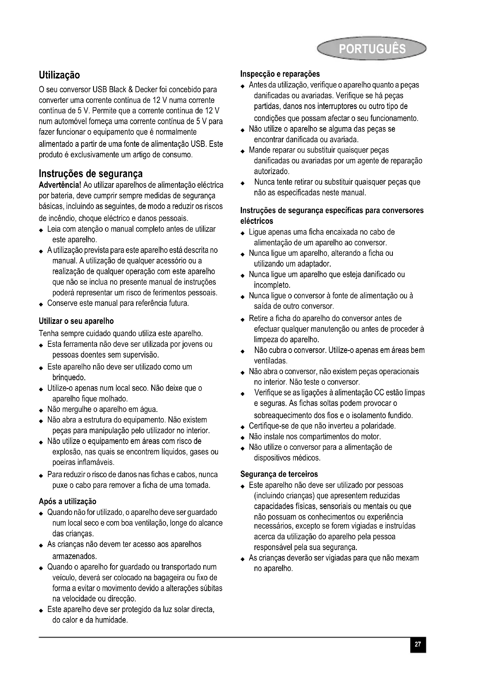 O seu conversor USB Black & Deckeruí concebido para converter uma corrente continua de 12V numa corrente continua de 5 V. Permite que a corrente continua de 12 V num automóvel forneça uma corrente continua de 5 V para fazerestrionar o equipamento que é normalmente alimentado a partir de uma fonte de alimentação USB. Este produits é exclusivamente um artigo de consumo.