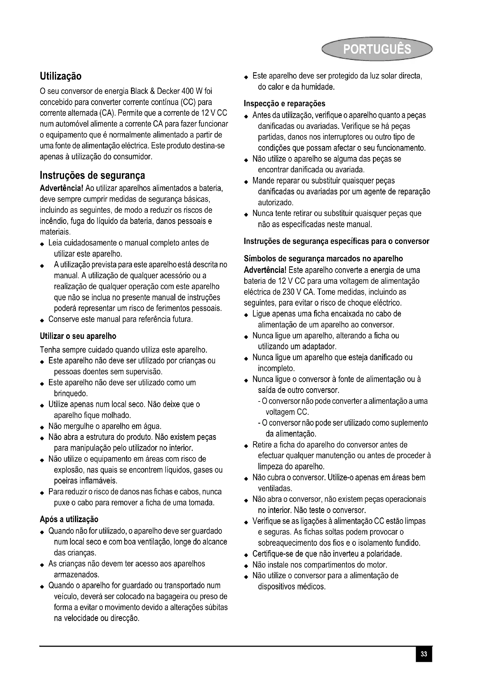 O seu conversor de energia Black & Decker 400 W foi concebido para converter corrente continua (CC) para corrente alternada (CA). Permitte que a corrente de 12V CC num automóvel alimente a corrente CA para fazer funcionalo equipamento que é normalmente alimentado a partir de uma fonte de alimentação eletrica. Este produit destina-se apenas à utilização do consumidor.