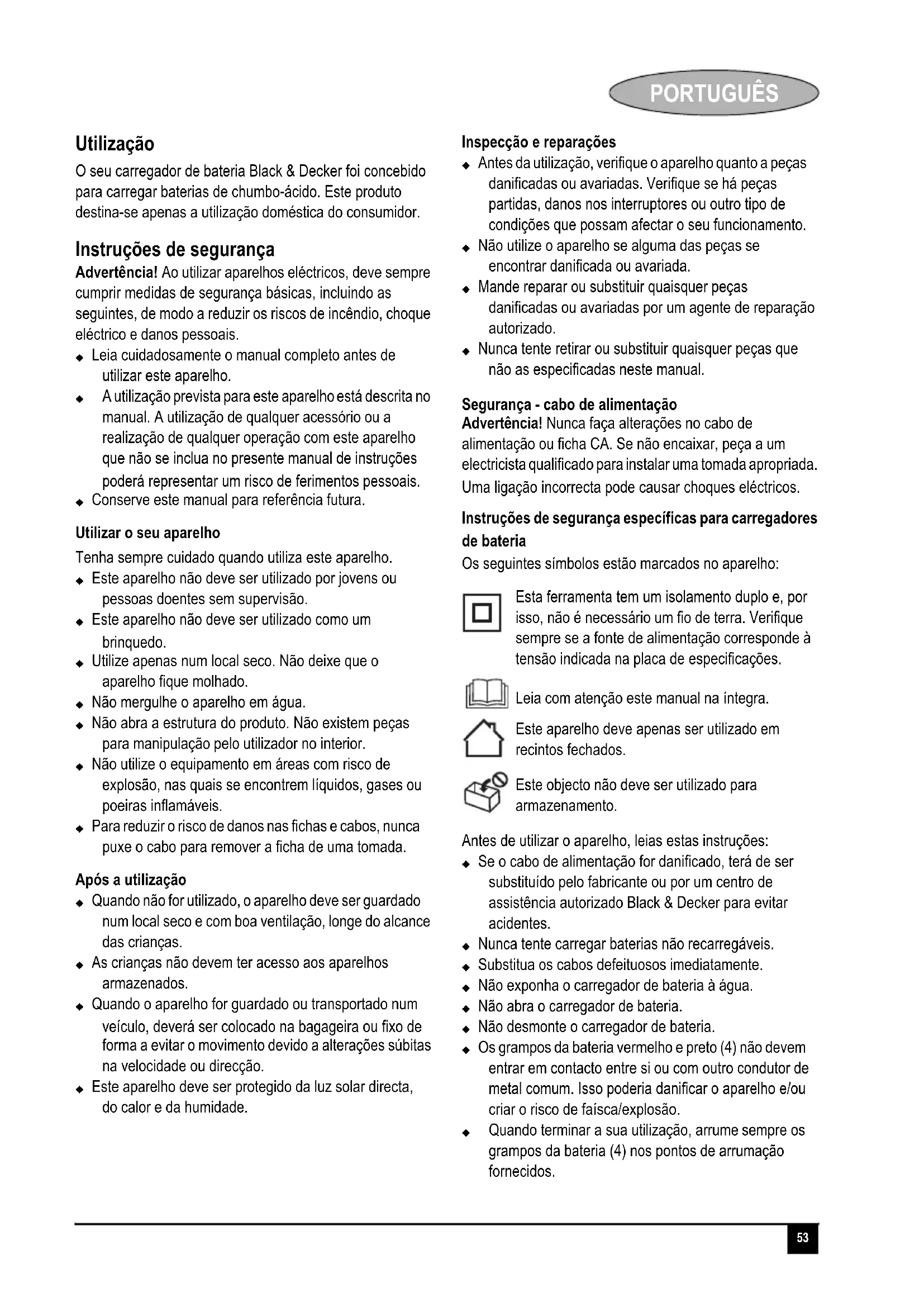 Advertência! Podem ser expelled gases explosivos das baterias de chumbo-acido quando estiverem a ser carregadas. Certifique-se de que a area possui uma boa ventilação e remove quaisquer fontes de ignicao quando estiver a carregarar a bateria.