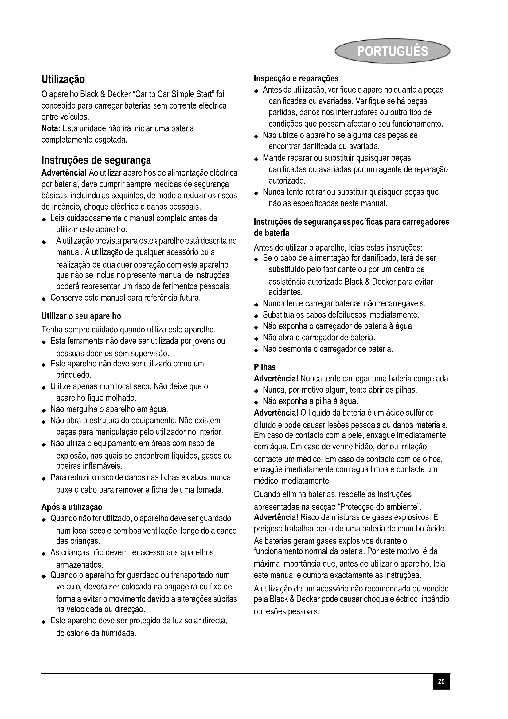 Black & Decker declara que estos productos cumplen las normas siguientes: EN60335, EN60598 El abajo firmante es responsable de la recopilación del archivo técnico y realiza esta declaración en nombre de Black & Decker. Kevin Hewitt Director de Ingeniería del Consumidor Spennymoor, County Durham, DL16 6JG, Reino Unido 12-08-2008 Garantía Black & Decker confía plenamente en la calidad de sus productos y ofrece una garantía extraordinaria. Esta declaración de garantía es un añadido, y en ningún caso un perjuicio para sus derechos estatutarios. La garantía es válida dentro de los territorios de los Estados miembros de la Unión Europea y de los de la Zona Europea de Libre Comercio. Recogida selectiva. No se debe desechar este producto con el resto de residuos domésticos. BDBBC2C Voltaje de entrada V de CC 12 Voltaje de salida V de CC 14,5 Corriente de salida (máx.) A 7,5 Peso kg 1,9324 ESPAÑOL Si cualquier producto de Black & Decker resultara defectuoso debido a materiales o mano de obra defectuosos o a la falta de conformidad, Black & Decker garantiza, dentro de los 24 meses posteriores a la fecha de compra, la sustitución de las piezas defectuosas, la reparación de los productos sujetos a un desgaste y rotura razonables o la sustitución de tales productos para garantizar al cliente el mínimo de inconvenientes, a menos que: X El producto se haya utilizado con propósitos comerciales, profesionales o de alquiler. X El producto se haya sometido a un uso inadecuado o negligente. X El producto haya sufrido daños causados por objetos o sustancias extrañas o accidentes. X Se hayan realizado reparaciones por parte de personas que no sean los servicios de reparación autorizados o personal de servicios de Black & Decker. Para reclamar en garantía, será necesario que presente la prueba de compra al vendedor o al servicio técnico de reparaciones autorizado. Puede consultar la dirección de su servicio técnico más cercano poniéndose en contacto con la oficina local de Black & Decker en la dirección que se indica en este manual. Como alternativa, puede consultar en Internet la lista de servicios técnicos autorizados e información completa de nuestros servicios de posventa y contactos, en la dirección siguiente,: www.2helpU.com Visite el sitio web www.blackanddecker.eu para registrar su nuevo producto Black & Decker y estar al día sobre productos y ofertas especiales. Encontrará información adicional sobre la marca Black & Decker y nuestra gama de productos en www.blackanddecker.eu.25 PORTUGUÊS Português Utilização O aparelho Black & Decker “Car to Car Simple Start” foi concebido para carregar baterias sem corrente eléctrica entre veículos. Nota: Esta unidade não irá iniciar uma bateria completamente esgotada. Instruções de segurança Advertência! Ao utilizar aparelhos de alimentação eléctrica por bateria, deve cumprir sempre medidas de segurança básicas, incluindo as seguintes, de modo a reduzir os riscos de incêndio, choque eléctrico e danos pessoais. X Leia cuidadosamente o manual completo antes de utilizar este aparelho. X A utilização prevista para este aparelho está descrita no manual. A utilização de qualquer acessório ou a realização de qualquer operação com este aparelho que não se inclua no presente manual de instruções poderá representar um risco de ferimentos pessoais. X Conserve este manual para referência futura. Utilizar o seu aparelho Tenha sempre cuidado quando utiliza este aparelho. X Esta ferramenta não deve ser utilizada por jovens ou pessoas doentes sem supervisão. X Este aparelho não deve ser utilizado como um brinquedo. X Utilize apenas num local seco. Não deixe que o aparelho fique molhado. X Não mergulhe o aparelho em água. X Não abra a estrutura do equipamento. Não existem peças para manipulação pelo utilizador no interior. X Não utilize o equipamento em áreas com risco de explosão, nas quais se encontrem líquidos, gases ou poeiras inflamáveis. X Para reduzir o risco de danos nas fichas e cabos, nunca puxe o cabo para remover a ficha de uma tomada. Após a utilização X Quando não for utilizado, o aparelho deve ser guardado num local seco e com boa ventilação, longe do alcance das crianças. X As crianças não devem ter acesso aos aparelhos armazenados. X Quando o aparelho for guardado ou transportado num veículo, deverá ser colocado na bagageira ou fixo de forma a evitar o movimento devido a alterações súbitas na velocidade ou direcção. X Este aparelho deve ser protegido da luz solar directa, do calor e da humidade. Inspecção e reparações X Antes da utilização, verifique o aparelho quanto a peças danificadas ou avariadas. Verifique se há peças partidas, danos nos interruptores ou outro tipo de condições que possam afectar o seu funcionamento. X Não utilize o aparelho se alguma das peças se encontrar danificada ou avariada. X Mande reparar ou substituir quaisquer peças danificadas ou avariadas por um agente de reparação autorizado. X Nunca tente retirar ou substituir quaisquer peças que não as especificadas neste manual. Instruções de segurança específicas para carregadores de bateria Antes de utilizar o aparelho, leias estas instruções: X Se o cabo de alimentação for danificado, terá de ser substituído pelo fabricante ou por um centro de assistência autorizado Black & Decker para evitar acidentes. X Nunca tente carregar baterias não recarregáveis. X Substitua os cabos defeituosos imediatamente. X Não exponha o carregador de bateria à água. X Não abra o carregador de bateria. X Não desmonte o carregador de bateria. Pilhas Advertência! Nunca tente carregar uma bateria congelada. X Nunca, por motivo algum, tente abrir as pilhas. X Não exponha a pilha à água. Advertência! O líquido da bateria é um ácido sulfúrico diluído e pode causar lesões pessoais ou danos materiais. Em caso de contacto com a pele, enxagúe imediatamente com água. E