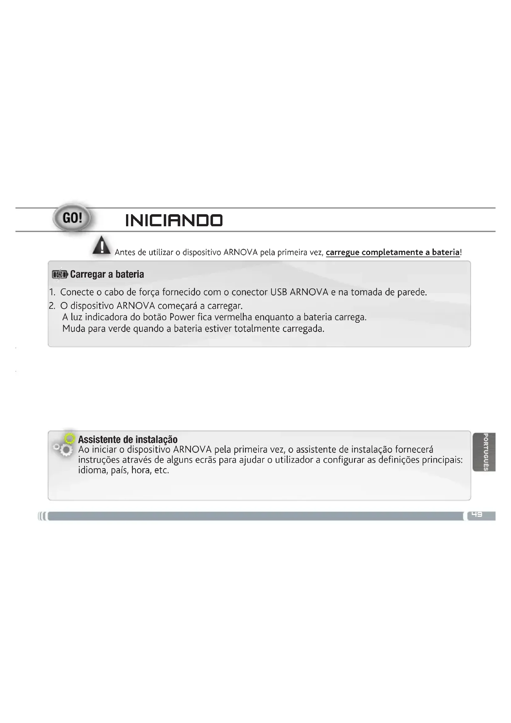 PORTUGUÊS INICIANDO Antes de utilizar o dispositivo ARNOVA pela primeira vez, carregue completamente a bateria! Carregar a bateria