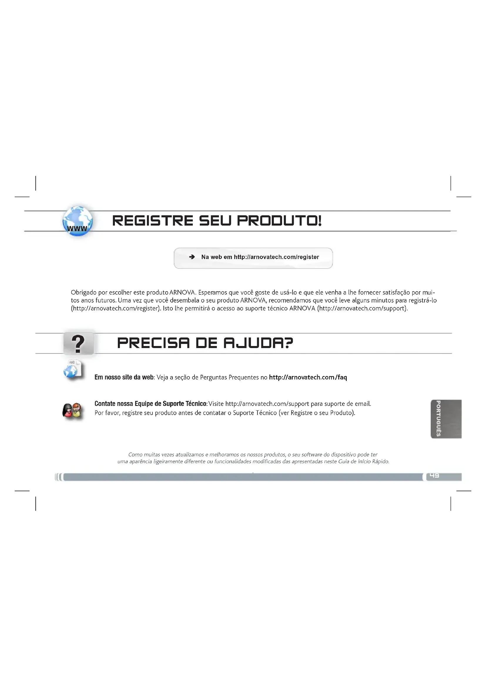 PORTUGUÊS REGISTRE SEU PRODUTO! Obrigado por escolher este produto ARNOVA. Esperamos que você goste de usá-lo e que ele venha a lhe fornecer satisfação por mui- tos anos futuros. Uma vez que você desembala o seu produto ARNOVA, recomendamos que você leve alguns minutos para registrá-lo (http://arnovatech.com/register). Isto lhe permitirá o acesso ao suporte técnico ARNOVA (http://arnovatech.com/support). Ä Na web em http://arnovatech.com/register PRECISA DE AJUDA? Como muitas vezes atualizamos e melhoramos os nossos produtos, o seu software do dispositivo pode ter uma aparência ligeiramente diferente ou funcionalidades modificadas das apresentadas neste Guia de Início Rápido.