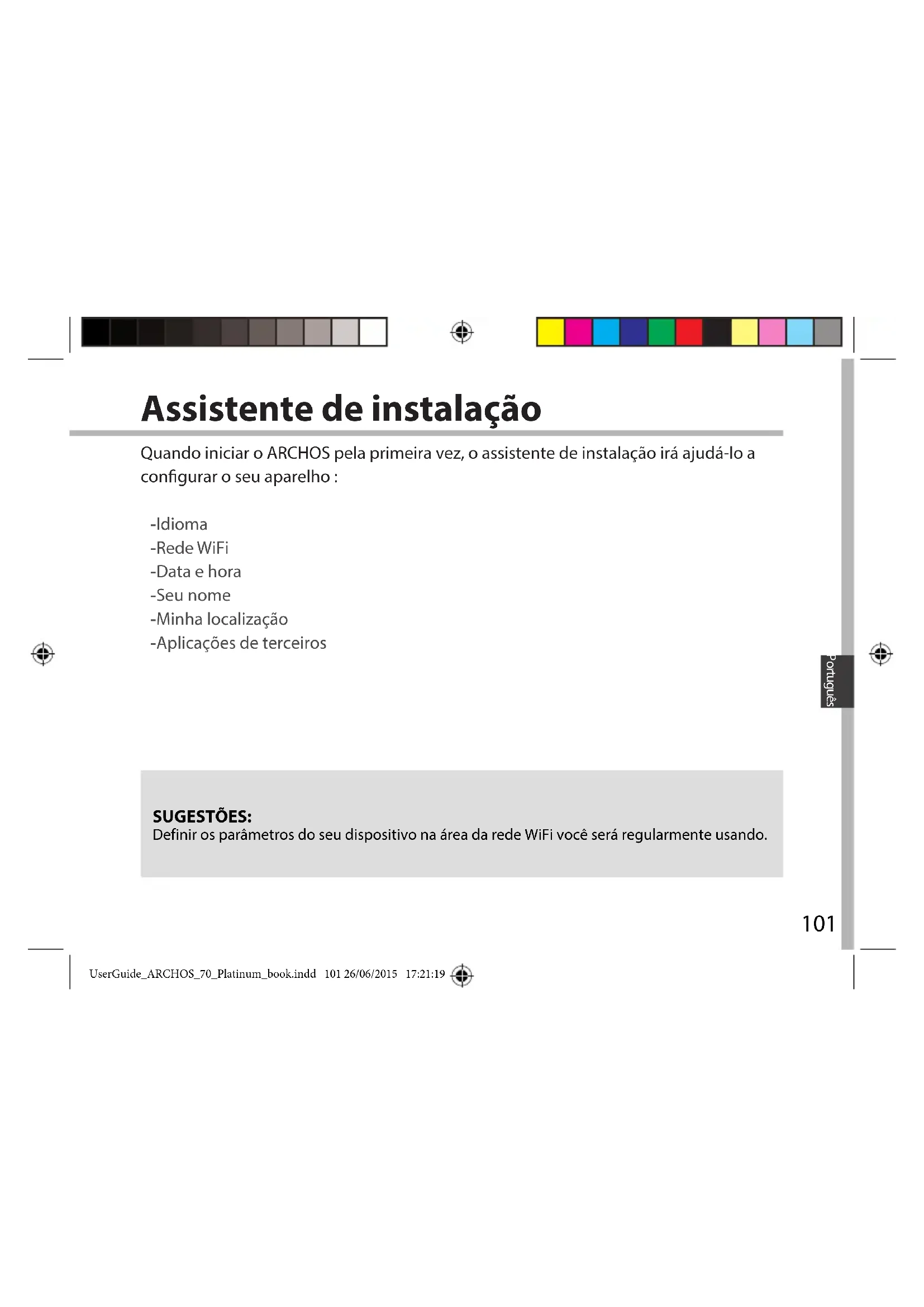 UserGuide_ARCHOS_70_Platinum_book.indd 100 26/06/2015 17:21:19101 Português Assistente de instalação SUGESTÕES: Definir os parâmetros do seu dispositivo na área da rede WiFi você será regularmente usando. Quando iniciar o ARCHOS pela primeira vez, o assistente de instalação irá ajudá-lo a congurar o seu aparelho : - Idioma - Rede WiFi - Data e hora - Seu nome - Minha localização - Aplicações de terceiros UserGuide_ARCHOS_70_Platinum_book.indd 101 26/06/2015 17:21:19102