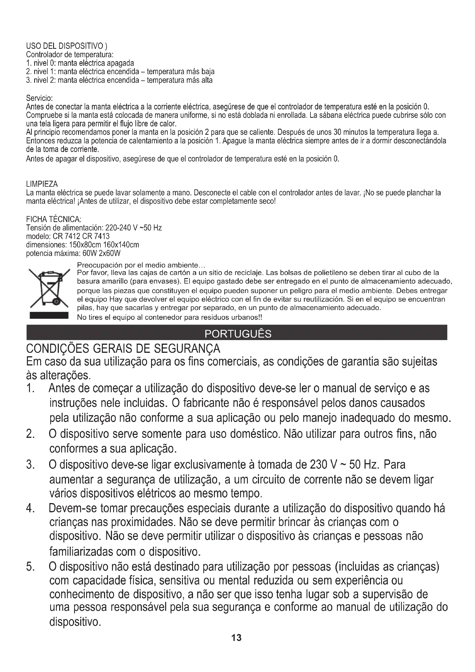 CR 7413 - Cobertor/almofada térmica CAMRY - Manual de utilização gratuito