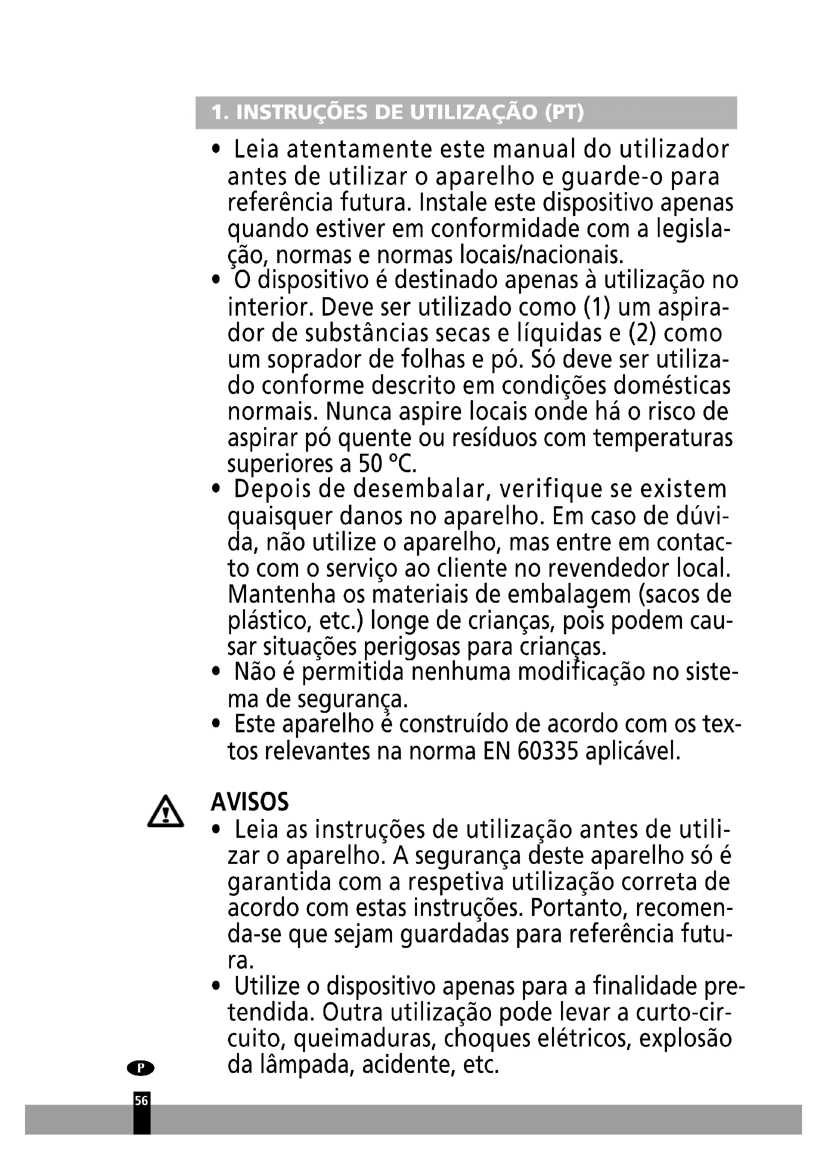 - Este aparelho é construído de acordo com os tex- tos relevantes na norma EN 60335 aplicável. AVISOS
