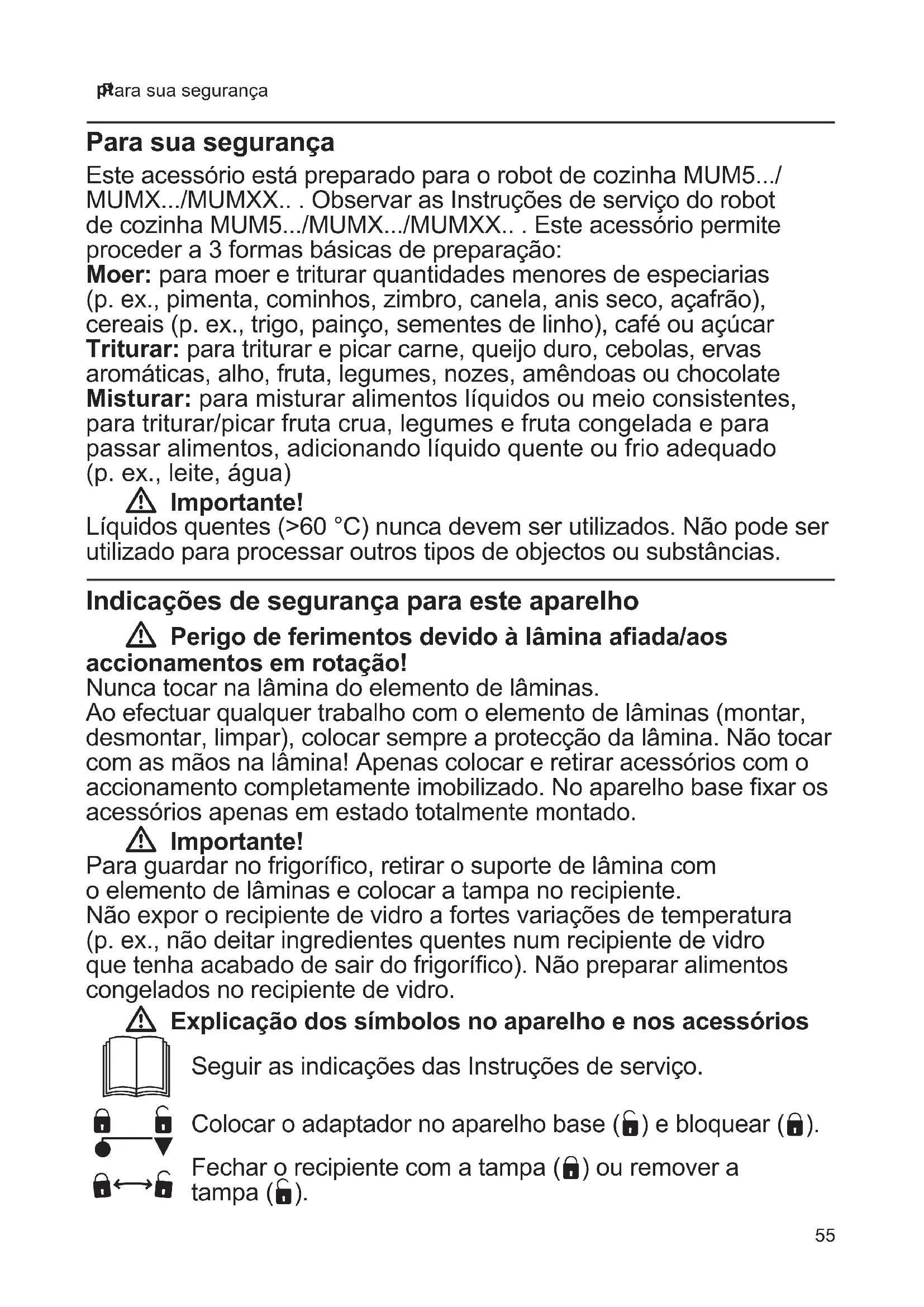 Para sua segurança Para sua segurança Este acessório está preparado para o robot de cozinha MUM5.../ MUMX.../MUMXX.. . Observar as Instruções de serviço do robot de cozinha MUM5.../MUMX.../MUMXX.. . Este acessório permite proceder a 3 formas básicas de preparação: Moer: para moer e triturar quantidades menores de especiarias (p. ex., pimenta, cominhos, zimbro, canela, anis seco, açafrão), cereais (p. ex., trigo, painço, sementes de linho), café ou açúcar Triturar: para triturar e picar carne, queijo duro, cebolas, ervas aromáticas, alho, fruta, legumes, nozes, amêndoas ou chocolate Misturar: para misturar alimentos líquidos ou meio consistentes, para triturar/picar fruta crua, legumes e fruta congelada e para passar alimentos, adicionando líquido quente ou frio adequado (p. ex., leite, água) W Importante! Líquidos quentes (>60 °C) nunca devem ser utilizados. Não pode ser utilizado para processar outros tipos de objectos ou substâncias. Indicações de segurança para este aparelho W Perigo de ferimentos devido à lâmina aada/aos accionamentos em rotação! Nunca tocar na lâmina do elemento de lâminas. Ao efectuar qualquer trabalho com o elemento de lâminas (montar, desmontar, limpar), colocar sempre a protecção da lâmina. Não tocar com as mãos na lâmina! Apenas colocar e retirar acessórios com o accionamento completamente imobilizado. No aparelho base xar os acessórios apenas em estado totalmente montado. W Importante! Para guardar no frigoríco, retirar o suporte de lâmina com o elemento de lâminas e colocar a tampa no recipiente. Não expor o recipiente de vidro a fortes variações de temperatura (p. ex., não deitar ingredientes quentes num recipiente de vidro que tenha acabado de sair do frigoríco). Não preparar alimentos congelados no recipiente de vidro. W Explicação dos símbolos no aparelho e nos acessórios