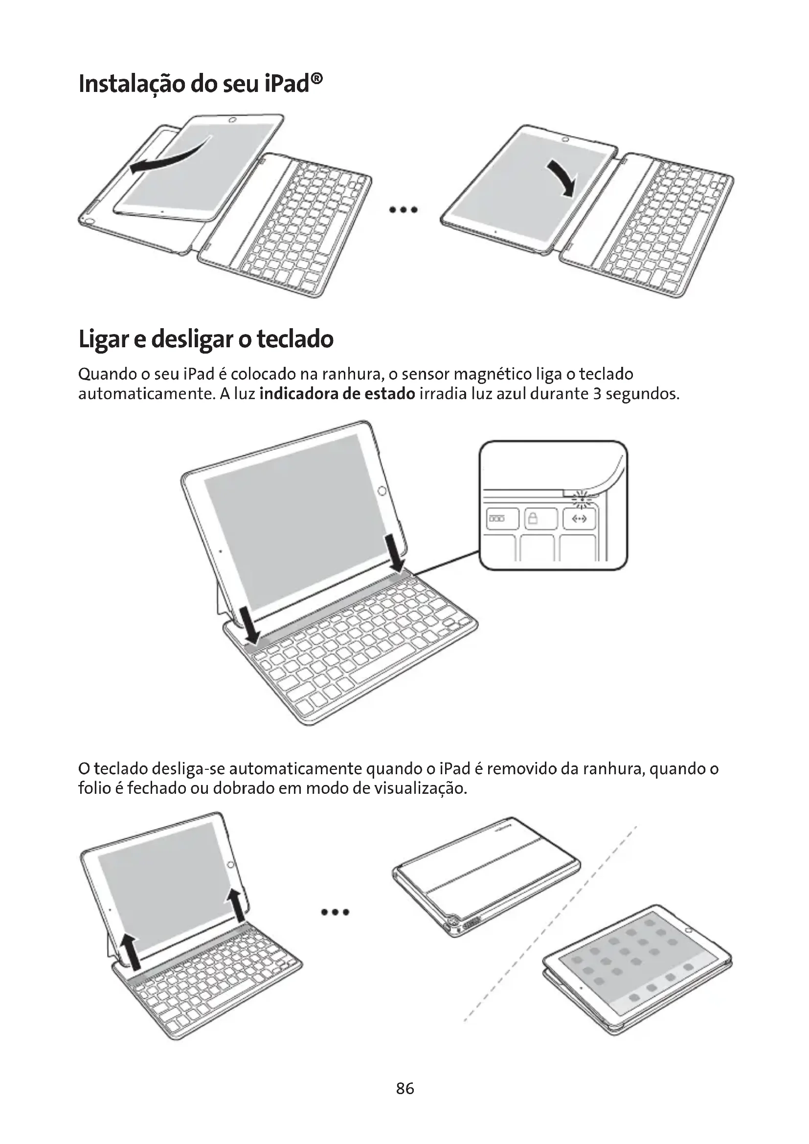 Quando o seu iPad é colocado na ranhura, o sensor magnétique liga o teclado automaticamente. A luz indicaça de estado irradia luz azul durante 3 segundos.