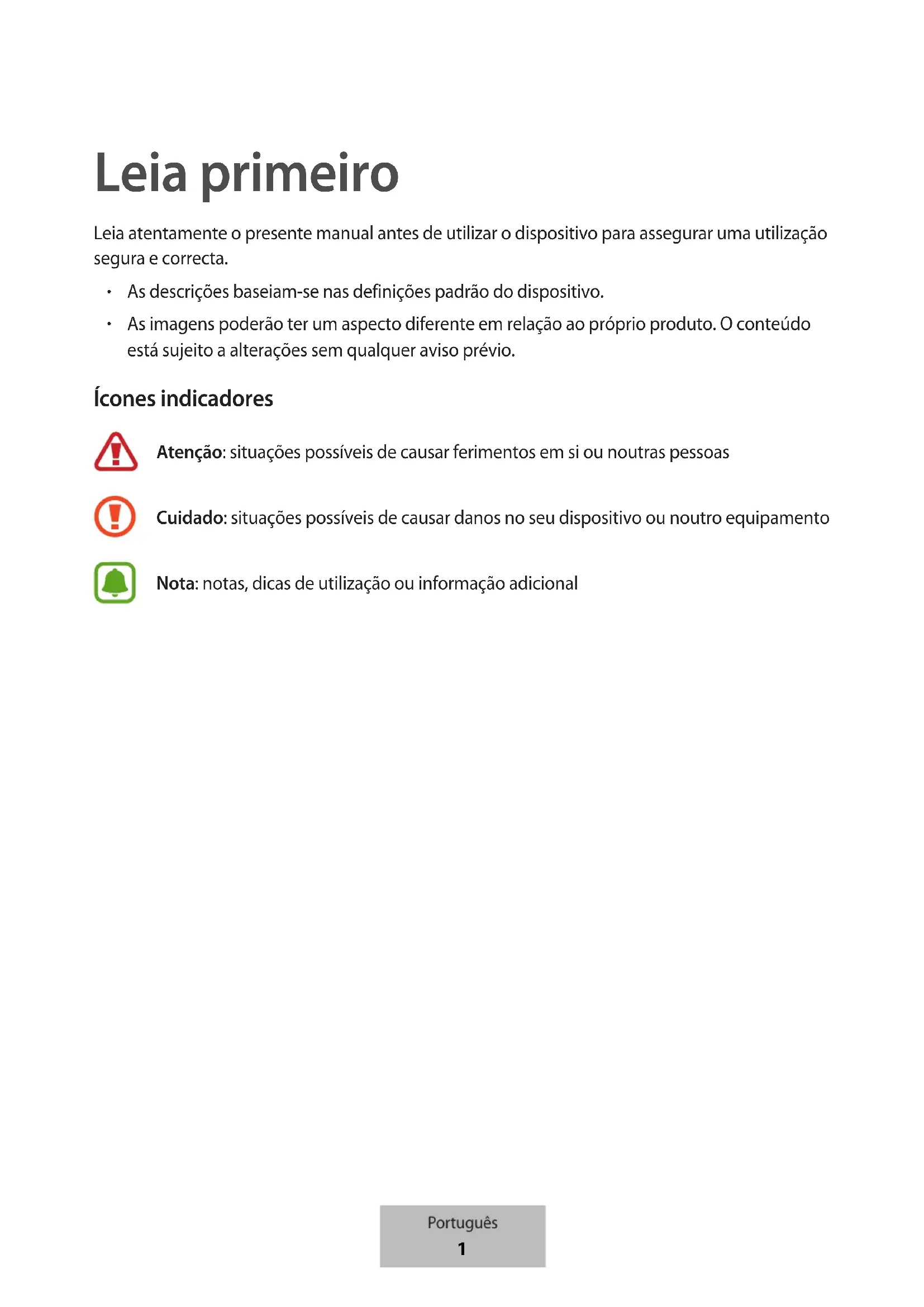 As imagens poderão ter um aspecto diferente em relação ao próprio produto. O conteúdo está sujeito a alterações sem qualquer aviso prévio. Ícones indicadores Atenção: situações possíveis de causar ferimentos em si ou noutras pessoas Cuidado: situações possíveis de causar danos no seu dispositivo ou noutro equipamento Nota: notas, dicas de utilização ou informação adicional Português