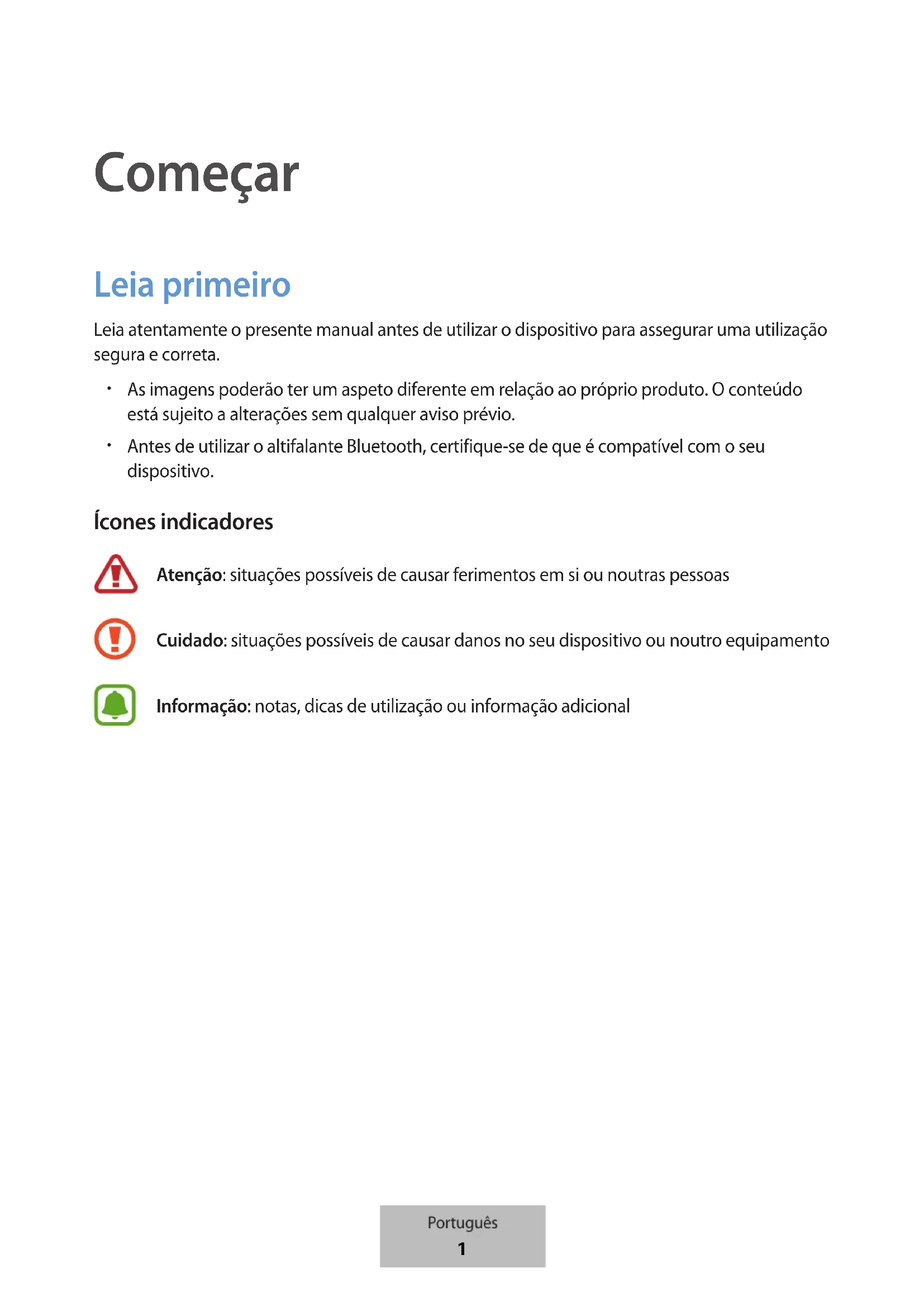 Antes de utilizar o altifalante Bluetooth, certifique-se de que é compatível com o seu dispositivo. Ícones indicadores Atenção: situações possíveis de causar ferimentos em si ou noutras pessoas Cuidado: situações possíveis de causar danos no seu dispositivo ou noutro equipamento Informação: notas, dicas de utilização ou informação adicional Português 1Começar