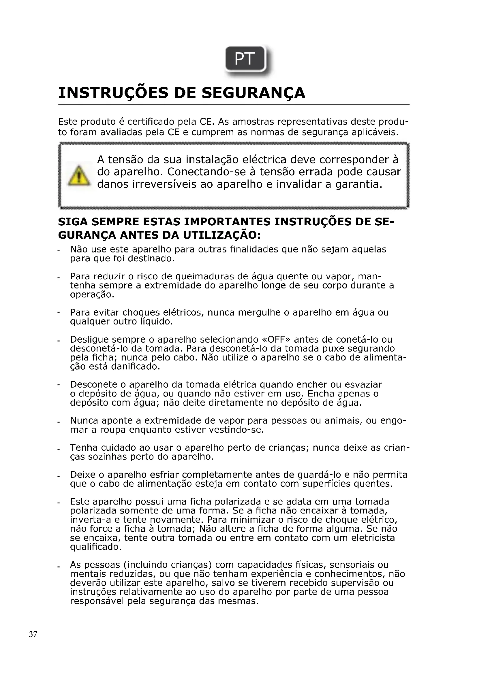 SIGA SEMPRE ESTAS IMPORTANTES INSTRUÇÕES DE SE- GURANÇA ANTES DA UTILIZAÇÃO: Este produto é certicado pela CE. As amostras representativas deste produ- to foram avaliadas pela CE e cumprem as normas de segurança aplicáveis. Não use este aparelho para outras nalidades que não sejam aquelas para que foi destinado. Para reduzir o risco de queimaduras de água quente ou vapor, man- tenha sempre a extremidade do aparelho longe de seu corpo durante a operação. Para evitar choques elétricos, nunca mergulhe o aparelho em água ou qualquer outro líquido. Desligue sempre o aparelho selecionando «OFF» antes de conetá-lo ou desconetá-lo da tomada. Para desconetá-lo da tomada puxe segurando pela cha; nunca pelo cabo. Não utilize o aparelho se o cabo de alimenta- ção está danicado. Desconete o aparelho da tomada elétrica quando encher ou esvaziar o depósito de água, ou quando não estiver em uso. Encha apenas o depósito com água; não deite diretamente no depósito de água. Nunca aponte a extremidade de vapor para pessoas ou animais, ou engo- mar a roupa enquanto estiver vestindo-se. Tenha cuidado ao usar o aparelho perto de crianças; nunca deixe as crian- ças sozinhas perto do aparelho. Deixe o aparelho esfriar completamente antes de guardá-lo e não permita que o cabo de alimentação esteja em contato com superfícies quentes. Este aparelho possui uma cha polarizada e se adata em uma tomada polarizada somente de uma forma. Se a cha não encaixar à tomada, inverta-a e tente novamente. Para minimizar o risco de choque elétrico, não force a cha à tomada; Não altere a cha de forma alguma. Se não se encaixa, tente outra tomada ou entre em contato com um eletricista qualicado. As pessoas (incluindo crianças) com capacidades físicas, sensoriais ou mentais reduzidas, ou que não tenham experiência e conhecimentos, não deverão utilizar este aparelho, salvo se tiverem recebido supervisão ou instruções relativamente ao uso do aparelho por parte de uma pessoa responsável pela segurança das mesmas. A tensão da sua instalação eléctrica deve corresponder à do aparelho. Conectando-se à tensão errada pode causar danos irreversíveis ao aparelho e invalidar a garantia. PT38 As crianças a partir dos 8 anos de idade e as pessoas com capacidades físicas, sensoriais ou mentais reduzidas, ou que não tenham experiência e conhecimen- tos, podem utilizar este aparelho se ti- verem recebido supervisão ou instruções relativamente ao uso do aparelho de forma segura e desde que compreen- dam os perigos envolvidos. As crianças não devem brincar com o aparelho. As crianças não devem proceder à lim- peza e à manutenção do aparelho sem supervisão. Para obter instruções de manutenção pelo utilizador, consulte a secção “Ma- nutenção”. Se o cabo de alimentação estiver dani- cado, deve ser substituído pelo fabri- cante, pelo fornecedor de serviços de as- sistência ou por uma pessoa igualmente classicada, a m de evitar qualquer tipo de perigo. É necessário cuidado ao utilizar o apa- relho, devido à emissão de vapor. Desconete o aparelho da tomada elétrica quando encher ou esvaziar o depósito de água, ou quando não estiver em uso. PT39 As crianças devem ser vigiadas para garantir que não brincam com o aparelho. Não utilize o aparelho se o cabo de alimentação tiver caído ou estiver danicado. Para evitar o risco de ferimentos, incêndio ou choque elétrico, não tente desmontar ou consertar o aparelho; leve-o para um centro de serviço especializado em consertos. Tenha cuidado ao esvaziar o depósito de água após o uso; a água no depósito pode estar quente. Não toque nas partes metálicas até que a unidade tenha esfriado, para evitar o risco de queimaduras; cuidado ao alterar as conexões, podem estar quentes ou conter água quente. Mantenha sempre a mangueira e o bocal elevados acima do depósito de água. Emita o vapor através de um movimento vertical de cima para baixo. Usando o aparelho a vapor numa posição horizontal ou inclinando-o para trás, pode haver perda de água quente. Pendure sempre a extremidade no suporte/gancho adequado. Nunca coloque a extremidade do aparelho a vapor no chão, nos móveis ou sobre o cabo de alimentação enquanto estiver quente ou ligado, pois isso pode resultar em incêndio ou choque elétrico. Nunca deixe cair ou insira objetos na mangueira ou qualquer uma das aberturas. A utilização dos acessórios e das conexões diferentes daqueles fornecidos pela SteamOne não é recomendada e pode resultar em incêndio, choque elétrico ou ferimentos pessoais. Esta unidade é apenas para uso interno. Não corte nem tente estender a mangueira do vapor. Para evitar o sobreaquecimento do aparelho, por favor, certique-se de que a haste telescópica seja estendida na sua posição mais alta antes de pendurar roupas no cabide para ser engomadas. Não utilize o vaporizador a seco. Para evitar uma sobrecarga do circuito, não utilize outro aparelho de alta potência no mesmo circuito. Se necessário, use um cabo de extensão projetado especicamente para aparelhos, os cabos menores podem superaquecer. INSTRUÇÕES ESPECIAIS: PT40 - O seu produto contém materiais que podem ser recuperados ou reciclados. - Ao descartá-lo, leve-o para um centro de recicla- gem ou um centro de serviços autorizado. GUARDE ESTAS INSTRUÇÕES: Responsabilidade Ambiental Garantia Garantia da SteamOne Este produto é coberto pela SteamOne durante o seu período de garantia (os detalhes de contato estão na página 41) em relação a qualquer defeito de produção. A garantia é valida por 2 anos da data da compra e no país especicado. A presente garantia de SteamOne está além dos seus direitos de consumidor. Todos os custos de reparo derivantes de um produto reconhecido como de- feituoso estão cobertos pela garantia da SteamOne, a m de devolvê-los a um estado de conformidade com as suas caraterísticas originais, através do repa