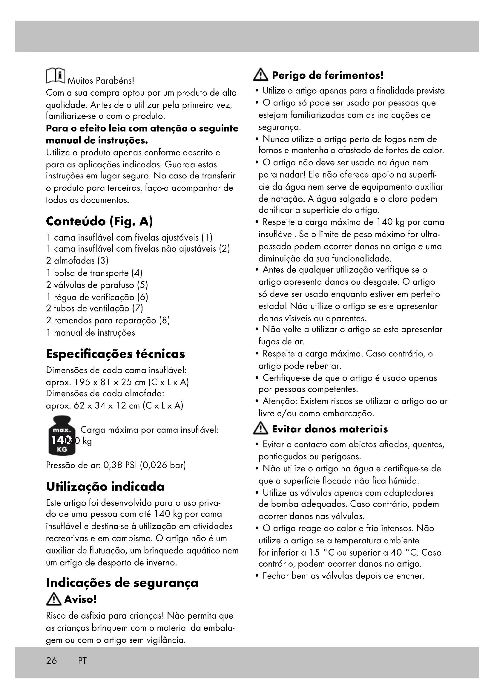- Respeite a entrega maior de 140 kg por cama insuflavel. Se o limite de peso maior for ultrapassado podem ocorrir danos no artigo e uma diminuicao da sua funcionalidade.