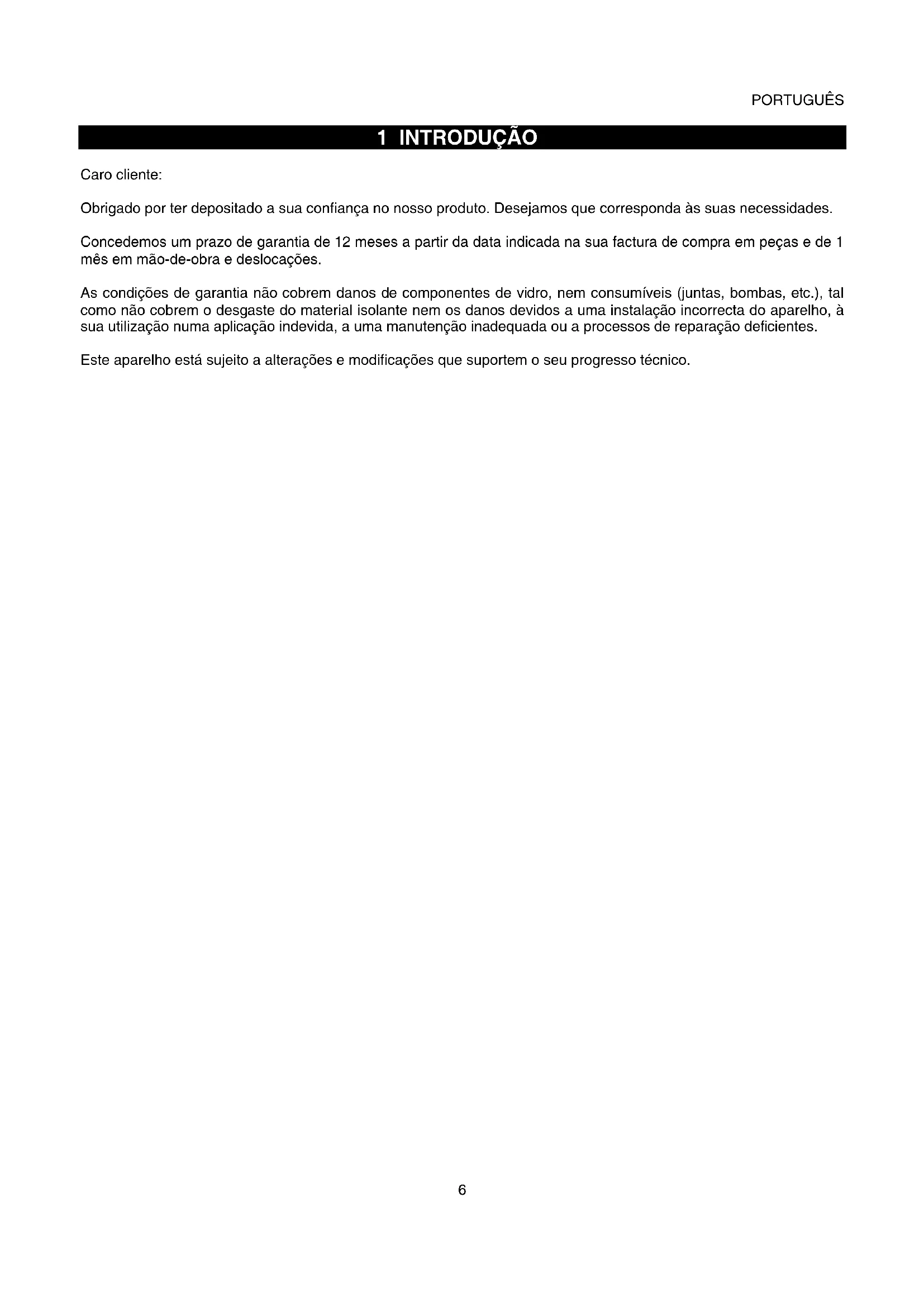 1 INTRODUÇÃO Caro cliente: Obrigado por ter depositado a sua confiança no nosso produto. Desejamos que corresponda às suas necessidades. Concedemos um prazo de garantia de 12 meses a partir da data indicada na sua factura de compra em peças e de 1 mês em mão-de-obra e deslocações. As condições de garantia não cobrem danos de componentes de vidro, nem consumíveis (juntas, bombas, etc.), tal como não cobrem o desgaste do material isolante nem os danos devidos a uma instalação incorrecta do aparelho, à sua utilização numa aplicação indevida, a uma manutenção inadequada ou a processos de reparação deficientes. Este aparelho está sujeito a alterações e modificações que suportem o seu progresso técnico.PORTUGUÊS