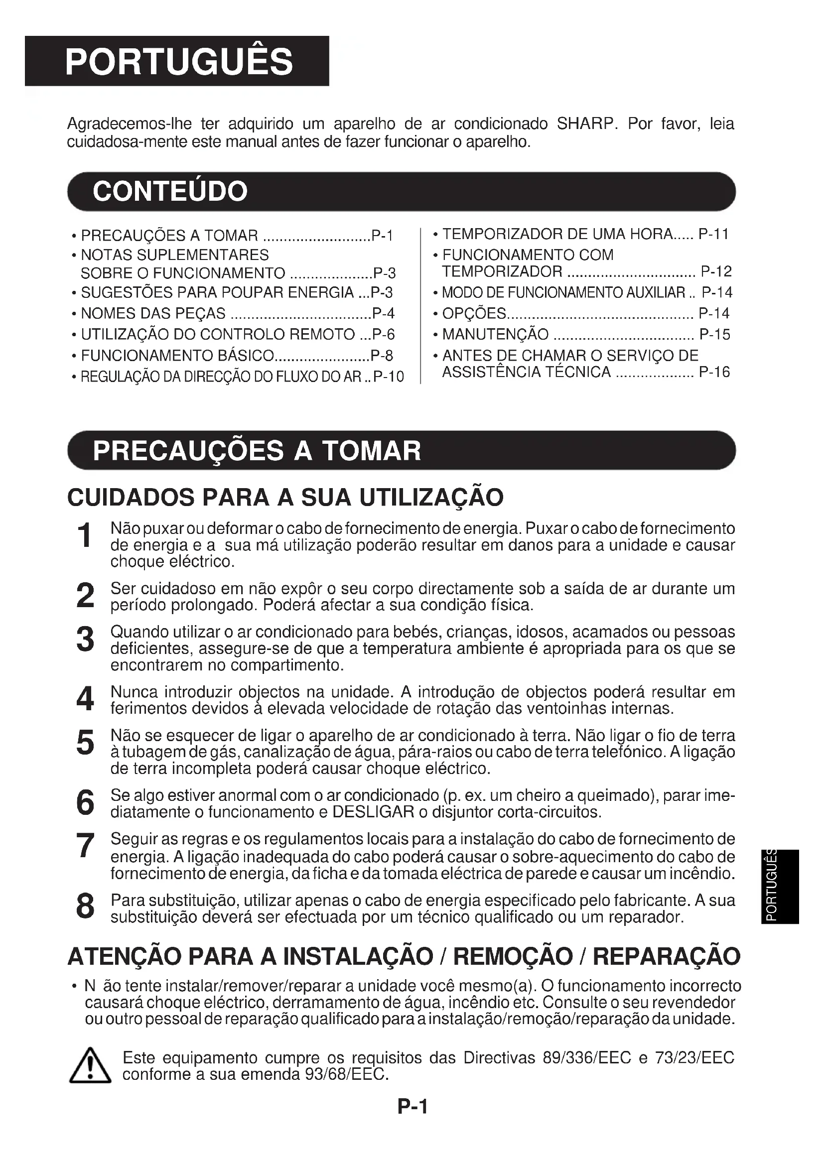 - Nel modo di funzionamento RISCALDAMENTO, del vapore acqueo può fuoriuscire dall’unità esterna durante lo sbrinamento. (Solo per i modelli AY-A07CR/AY- A09CR/AY-A12CR) Richiedete dell'assistenza tecnica quando lampeggiano sul pannello degli indicatori la spia FUNZIONAMENTO (OPERATION) e quella TIMER.PORTUGUÊS P-1 PORTUGUÊS Agradecemos-lhe ter adquirido um aparelho de ar condicionado SHARP. Por favor, leia cuidadosa-mente este manual antes de fazer funcionar o aparelho.• PRECAUÇÕES A TOMAR ..........................P-1• NOTAS SUPLEMENTARESSOBRE O FUNCIONAMENTO ....................P-3• SUGESTÕES PARA POUPAR ENERGIA ...P-3• NOMES DAS PEÇAS ..................................P-4• UTILIZAÇÃO DO CONTROLO REMOTO ...P-6• FUNCIONAMENTO BÁSICO.......................P-8 REGULAÇÃO DA DIRECÇÃO DO FLUXO DO AR .. P-10 CONTEÚDO