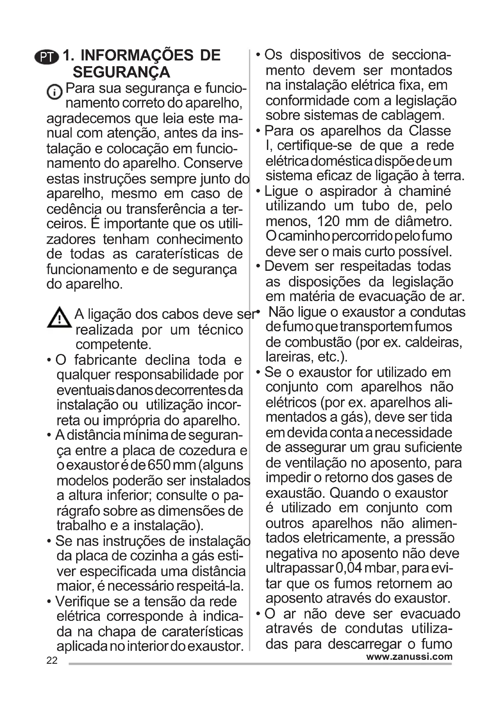 - O ar não deve ser evacuado através de condutas utiliza- das para descarregar o fumo PT23 www.zanussi.com de aparelhos de combustão alimentados a gás ou outros combustíveis.