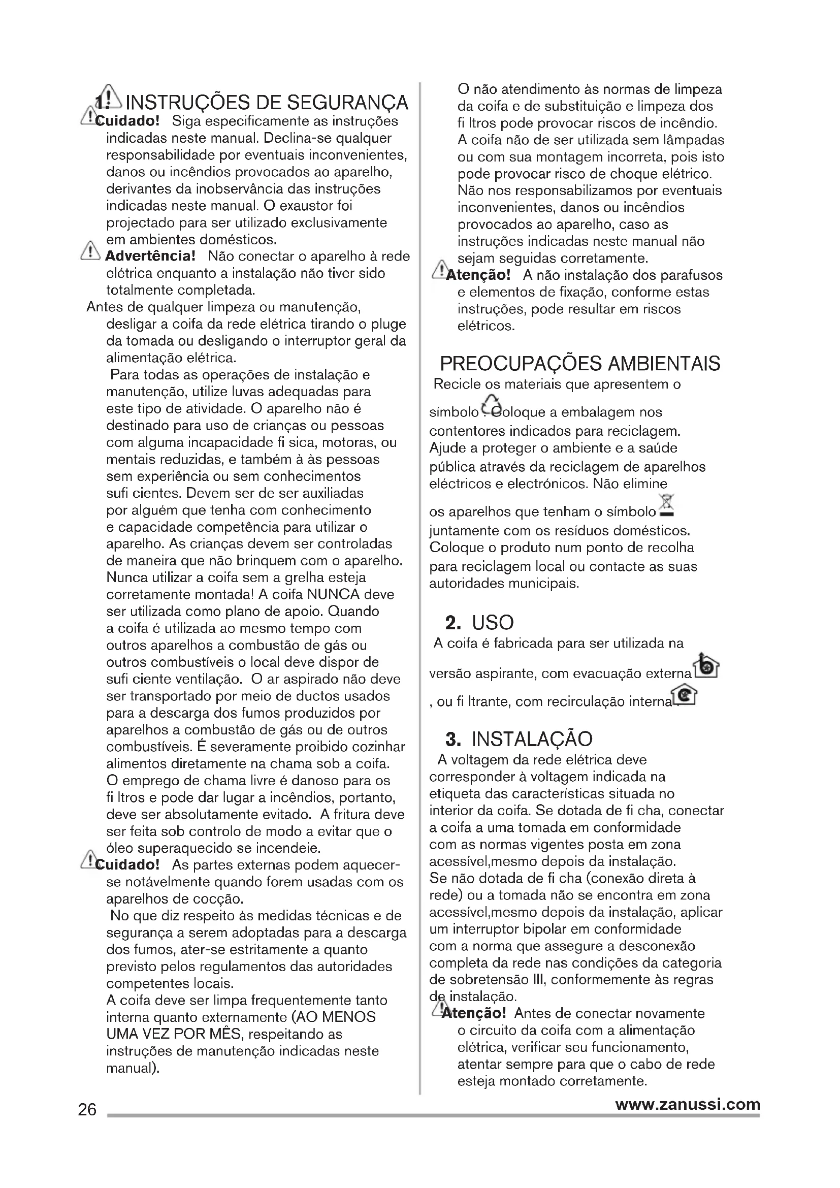 Cuidado! Siga especificamente as instruções indicadas neste manual. Declina-se qualquer responsabilidade por eventuais inconvenientes, danos ou incêndios provocados ao aparelho, derivantes da inobservância das instruções indicadas neste manual. O exaustor foi projectado para ser utilizado exclusivamente em ambientes domésticos. Advertência! Não conectar o aparelho à rede elétrica enquanto a instalação não tiver sido totalmente completada. Antes de qualquer limpeza ou manutenção, desligar a coifa da rede elétrica tirando o pluge da tomada ou desligando o interruptor geral da alimentação elétrica. Para todas as operações de instalação e manutenção, utilize luvas adequadas para este tipo de atividade. O aparelho não é destinado para uso de crianças ou pessoas com alguma incapacidade fi sica, motoras, ou mentais reduzidas, e também à às pessoas sem experiência ou sem conhecimentos sufi cientes. Devem ser de ser auxiliadas por alguém que tenha com conhecimento e capacidade competência para utilizar o aparelho. As crianças devem ser controladas de maneira que não brinquem com o aparelho. Nunca utilizar a coifa sem a grelha esteja corretamente montada! A coifa NUNCA deve ser utilizada como plano de apoio. Quando a coifa é utilizada ao mesmo tempo com outros aparelhos a combustão de gás ou outros combustíveis o local deve dispor de sufi ciente ventilação. O ar aspirado não deve ser transportado por meio de ductos usados para a descarga dos fumos produzidos por aparelhos a combustão de gás ou de outros combustíveis. É severamente proibido cozinhar alimentos diretamente na chama sob a coifa. O emprego de chama livre é danoso para os fi ltros e pode dar lugar a incêndios, portanto, deve ser absolutamente evitado. A fritura deve ser feita sob controlo de modo a evitar que o óleo superaquecido se incendeie. Cuidado! As partes externas podem aquecer- se notávelmente quando forem usadas com os aparelhos de cocção. No que diz respeito às medidas técnicas e de segurança a serem adoptadas para a descarga dos fumos, ater-se estritamente a quanto previsto pelos regulamentos das autoridades competentes locais. A coifa deve ser limpa frequentemente tanto interna quanto externamente (AO MENOS UMA VEZ POR MÊS, respeitando as instruções de manutenção indicadas neste manual). O não atendimento às normas de limpeza da coifa e de substituição e limpeza dos fi ltros pode provocar riscos de incêndio. A coifa não de ser utilizada sem lâmpadas ou com sua montagem incorreta, pois isto pode provocar risco de choque elétrico. Não nos responsabilizamos por eventuais inconvenientes, danos ou incêndios provocados ao aparelho, caso as instruções indicadas neste manual não sejam seguidas corretamente. Atenção! A não instalação dos parafusos e elementos de fixação, conforme estas instruções, pode resultar em riscos elétricos.