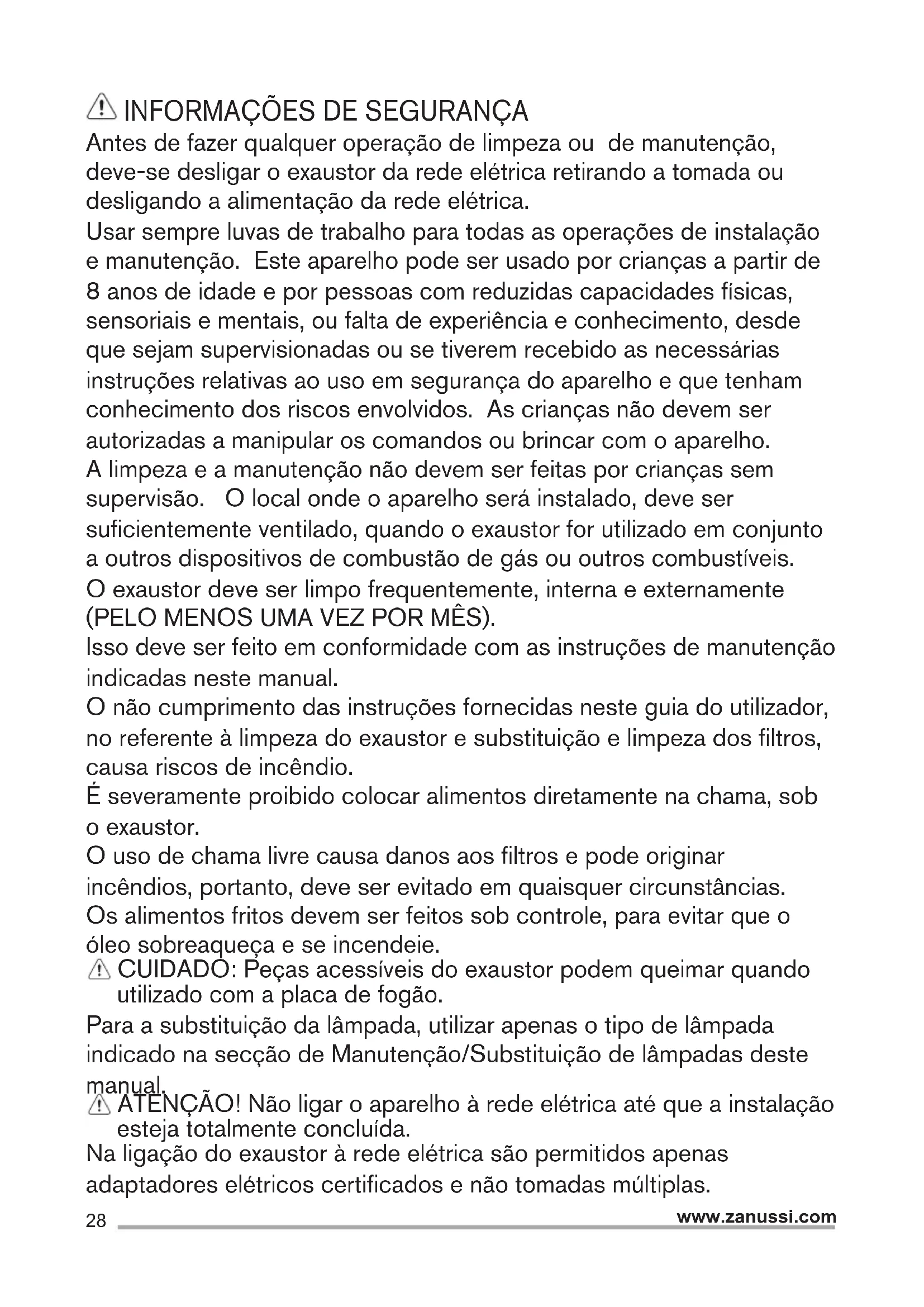 Antes de fazer qualquer operação de limpeza ou de manutenção, deve-se desligar o exaustor da rede elétrica retirando a tomada ou desligando a alimentação da rede elétrica. Usar sempre luvas de trabalho para todas as operações de instalação e manutenção. Este aparelho pode ser usado por crianças a partir de 8 anos de idade e por pessoas com reduzidas capacidades físicas, sensoriais e mentais, ou falta de experiência e conhecimento, desde que sejam supervisionadas ou se tiverem recebido as necessárias instruções relativas ao uso em segurança do aparelho e que tenham conhecimento dos riscos envolvidos. As crianças não devem ser autorizadas a manipular os comandos ou brincar com o aparelho. A limpeza e a manutenção não devem ser feitas por crianças sem supervisão. O local onde o aparelho será instalado, deve ser suficientemente ventilado, quando o exaustor for utilizado em conjunto a outros dispositivos de combustão de gás ou outros combustíveis. O exaustor deve ser limpo frequentemente, interna e externamente (PELO MENOS UMA VEZ POR MÊS). Isso deve ser feito em conformidade com as instruções de manutenção indicadas neste manual. O não cumprimento das instruções fornecidas neste guia do utilizador, no referente à limpeza do exaustor e substituição e limpeza dos filtros, causa riscos de incêndio. É severamente proibido colocar alimentos diretamente na chama, sob o exaustor. O uso de chama livre causa danos aos filtros e pode originar incêndios, portanto, deve ser evitado em quaisquer circunstâncias. Os alimentos fritos devem ser feitos sob controle, para evitar que o óleo sobreaqueça e se incendeie. CUIDADO: Peças acessíveis do exaustor podem queimar quando utilizado com a placa de fogão. Para a substituição da lâmpada, utilizar apenas o tipo de lâmpada indicado na secção de Manutenção/Substituição de lâmpadas deste manual. ATENÇÃO! Não ligar o aparelho à rede elétrica até que a instalação esteja totalmente concluída. Na ligação do exaustor à rede elétrica são permitidos apenas adaptadores elétricos certificados e não tomadas múltiplas.29 www.zanussi.com