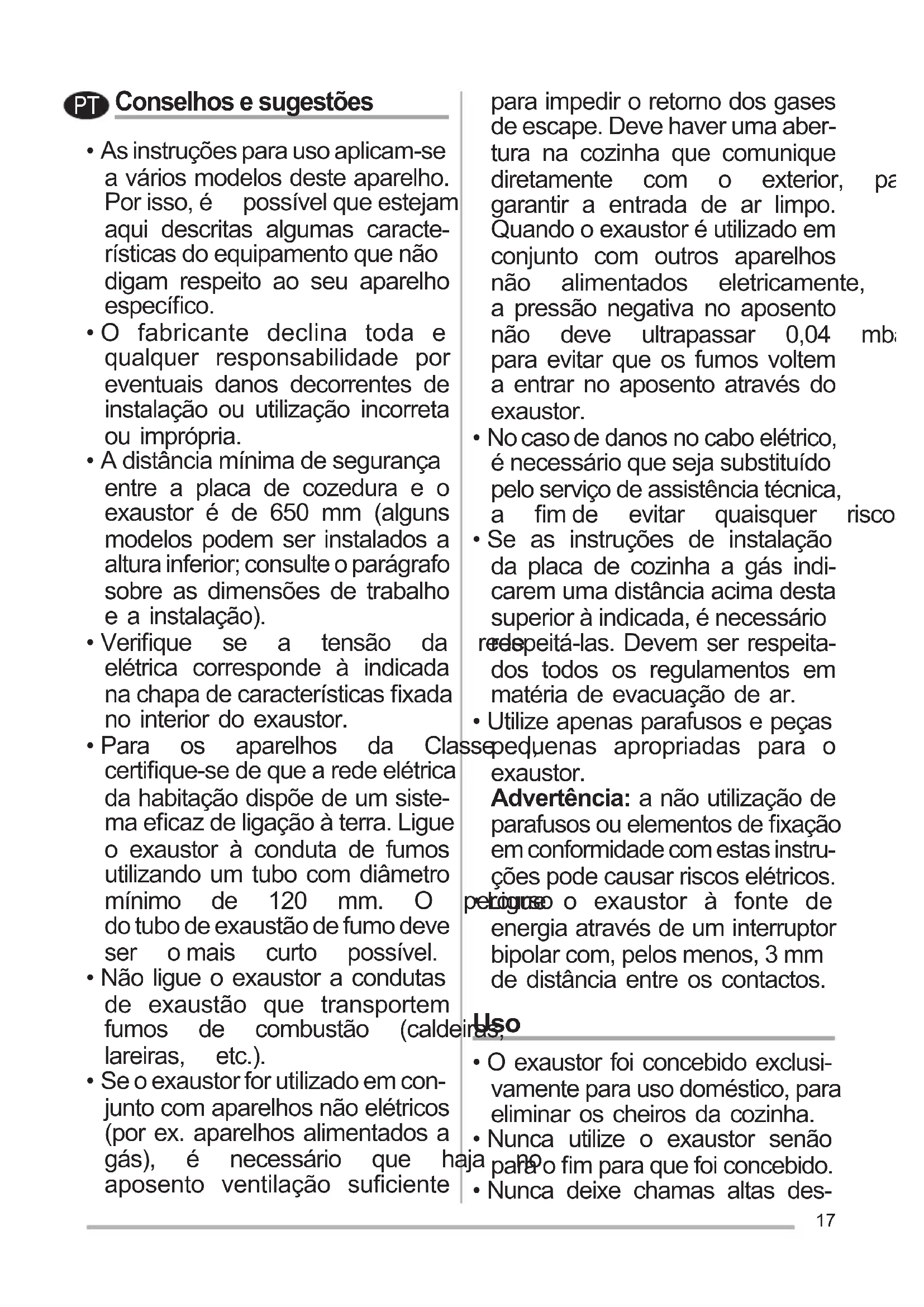 - Não ligue o exaustor a condutas de exaustão que transportem fumos de combustão (caldeiras, lareiras, etc.).