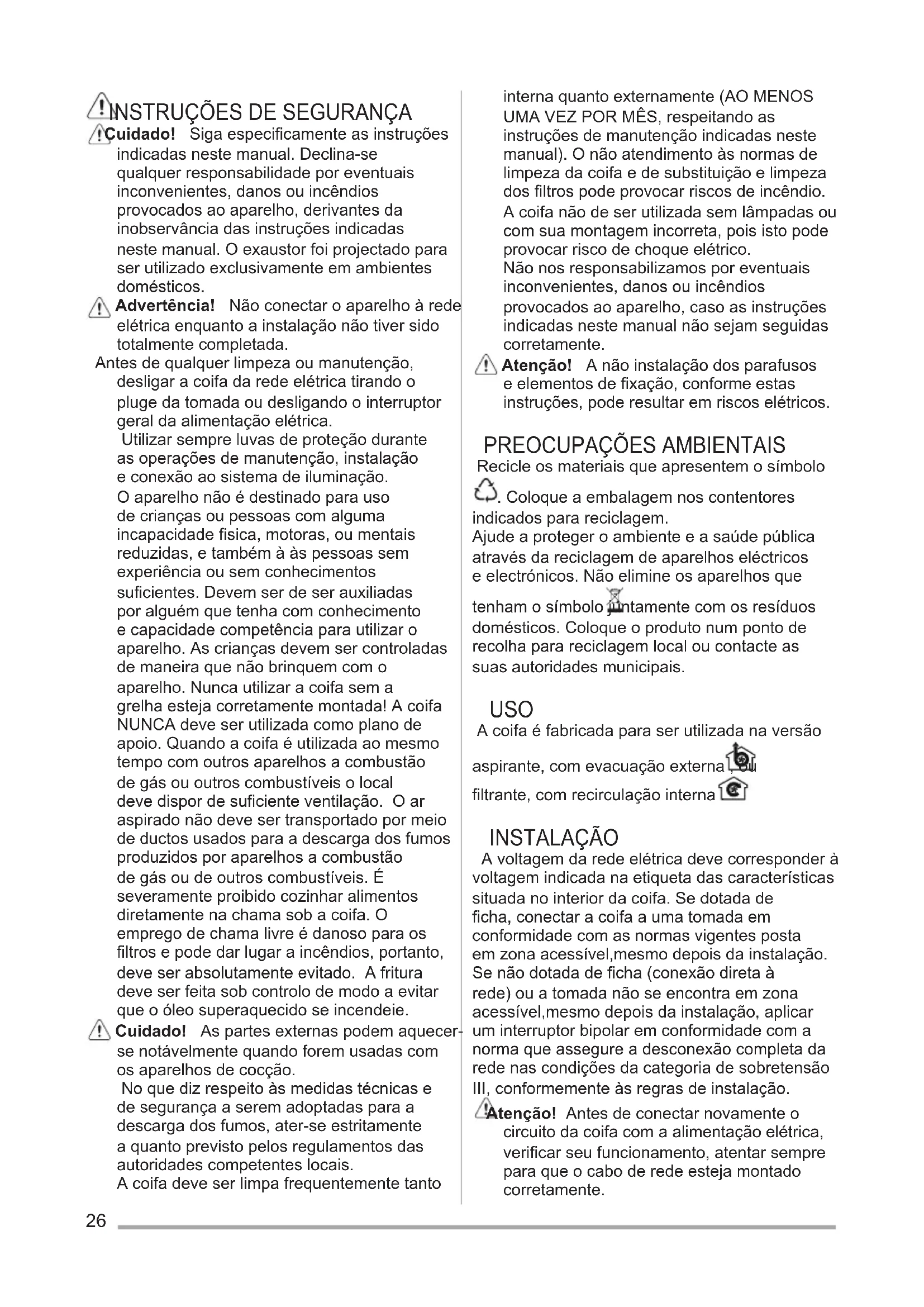 Cuidado! Siga especificamente as instruções indicadas neste manual. Declina-se qualquer responsabilidade por eventuais inconvenientes, danos ou incêndios provocados ao aparelho, derivantes da inobservância das instruções indicadas neste manual. O exaustor foi projectado para ser utilizado exclusivamente em ambientes domésticos. Advertência! Não conectar o aparelho à rede elétrica enquanto a instalação não tiver sido totalmente completada. Antes de qualquer limpeza ou manutenção, desligar a coifa da rede elétrica tirando o pluge da tomada ou desligando o interruptor geral da alimentação elétrica. Utilizar sempre luvas de proteção durante as operações de manutenção, instalação e conexão ao sistema de iluminação. O aparelho não é destinado para uso de crianças ou pessoas com alguma incapacidade fisica, motoras, ou mentais reduzidas, e também à às pessoas sem experiência ou sem conhecimentos suficientes. Devem ser de ser auxiliadas por alguém que tenha com conhecimento e capacidade competência para utilizar o aparelho. As crianças devem ser controladas de maneira que não brinquem com o aparelho. Nunca utilizar a coifa sem a grelha esteja corretamente montada! A coifa NUNCA deve ser utilizada como plano de apoio. Quando a coifa é utilizada ao mesmo tempo com outros aparelhos a combustão de gás ou outros combustíveis o local deve dispor de suficiente ventilação. O ar aspirado não deve ser transportado por meio de ductos usados para a descarga dos fumos produzidos por aparelhos a combustão de gás ou de outros combustíveis. É severamente proibido cozinhar alimentos diretamente na chama sob a coifa. O emprego de chama livre é danoso para os filtros e pode dar lugar a incêndios, portanto, deve ser absolutamente evitado. A fritura deve ser feita sob controlo de modo a evitar que o óleo superaquecido se incendeie. Cuidado! As partes externas podem aquecer- se notávelmente quando forem usadas com os aparelhos de cocção. No que diz respeito às medidas técnicas e de segurança a serem adoptadas para a descarga dos fumos, ater-se estritamente a quanto previsto pelos regulamentos das autoridades competentes locais. A coifa deve ser limpa frequentemente tanto interna quanto externamente (AO MENOS UMA VEZ POR MÊS, respeitando as instruções de manutenção indicadas neste manual). O não atendimento às normas de limpeza da coifa e de substituição e limpeza dos filtros pode provocar riscos de incêndio. A coifa não de ser utilizada sem lâmpadas ou com sua montagem incorreta, pois isto pode provocar risco de choque elétrico. Não nos responsabilizamos por eventuais inconvenientes, danos ou incêndios provocados ao aparelho, caso as instruções indicadas neste manual não sejam seguidas corretamente. Atenção! A não instalação dos parafusos e elementos de fixação, conforme estas instruções, pode resultar em riscos elétricos.
