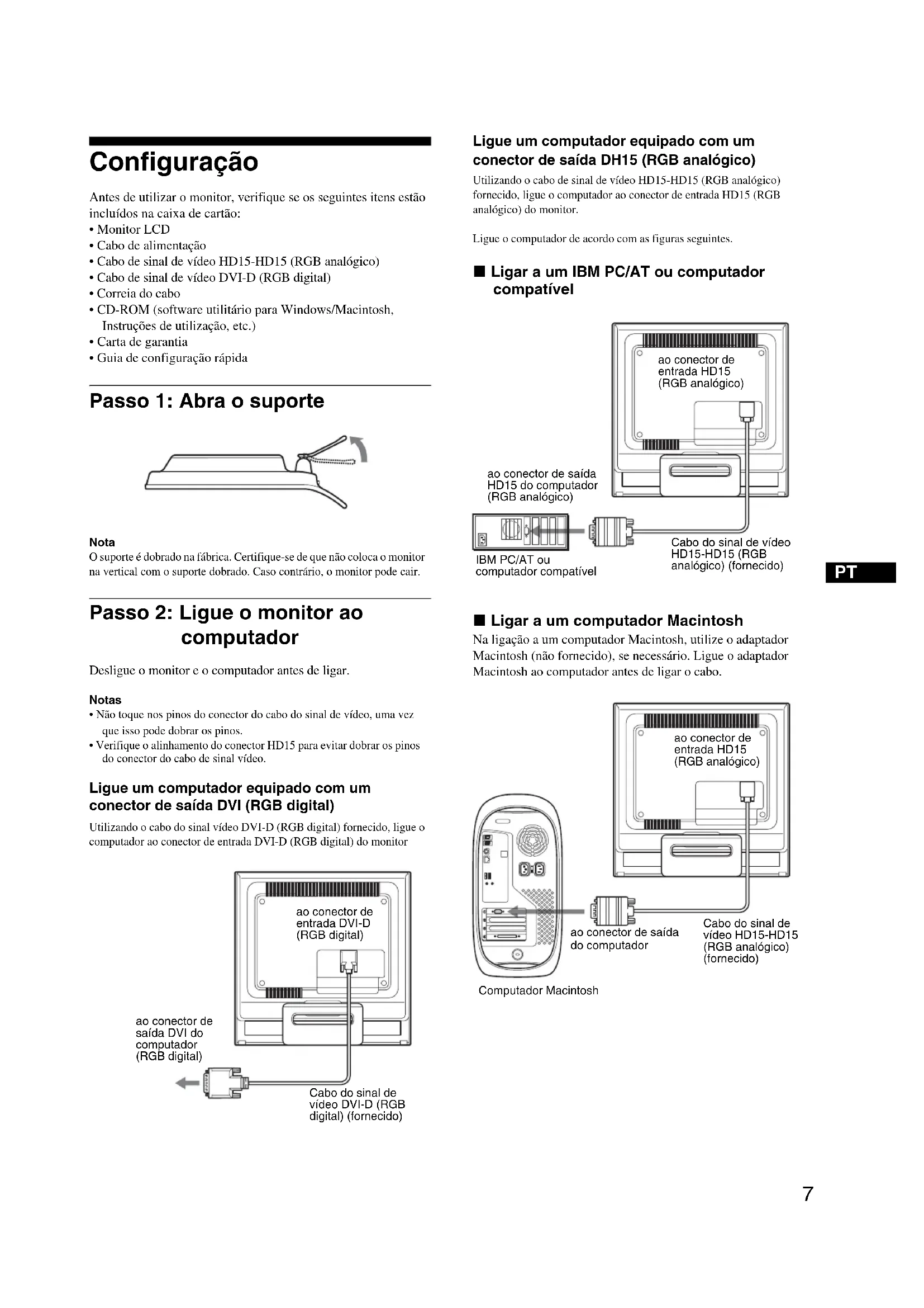 Configuração Antes de utilizar o monitor, verifique se os seguintes itens estão incluídos na caixa de cartão:• Monitor LCD• Cabo de alimentação• Cabo de sinal de vídeo HD15-HD15 (RGB analógico)• Cabo de sinal de vídeo DVI-D (RGB digital)• Correia do cabo• CD-ROM (software utilitário para Windows/Macintosh, Instruções de utilização, etc.)• Carta de garantia• Guia de configuração rápida Passo 1: Abra o suporte Nota O suporte é dobrado na fábrica. Certifique-se de que não coloca o monitor na vertical com o suporte dobrado. Caso contrário, o monitor pode cair. Passo 2: Ligue o monitor ao computador Desligue o monitor e o computador antes de ligar.Notas• Não toque nos pinos do conector do cabo do sinal de vídeo, uma vez que isso pode dobrar os pinos.• Verifique o alinhamento do conector HD15 para evitar dobrar os pinos do conector do cabo de sinal vídeo. Ligue um computador equipado com um conector de saída DVI (RGB digital) Utilizando o cabo do sinal vídeo DVI-D (RGB digital) fornecido, ligue o computador ao conector de entrada DVI-D (RGB digital) do monitor Ligue um computador equipado com um conector de saída DH15 (RGB analógico) Utilizando o cabo de sinal de vídeo HD15-HD15 (RGB analógico) fornecido, ligue o computador ao conector de entrada HD15 (RGB analógico) do monitor.Ligue o computador de acordo com as figuras seguintes. x Ligar a um IBM PC/AT ou computador compatível x Ligar a um computador Macintosh Na ligação a um computador Macintosh, utilize o adaptador Macintosh (não fornecido), se necessário. Ligue o adaptador Macintosh ao computador antes de ligar o cabo. ao conector de saída DVI do computador(RGB digital)ao conector de entrada DVI-D(RGB digital)Cabo do sinal de vídeo DVI-D (RGB digital) (fornecido)IBM PC/AT ou computador compatívelao conector de entrada HD15 (RGB analógico)ao conector de saída HD15 do computador(RGB analógico)Cabo do sinal de vídeo HD15-HD15 (RGB analógico) (fornecido)Computador Macintoshao conector de saída do computadorCabo do sinal de vídeo HD15-HD15 (RGB analógico) (fornecido)ao conector de entrada HD15 (RGB analógico)8 Passo 3: Ligar o cabo de alimentação Com o monitor e o computador desligados, ligue o cabo de alimentação ao monitor e, em seguida, ligue-o a uma tomada eléctrica. Passo 4: Prenda os fios e substitua a tampa traseira 1 Juntar os cabos e os fios Utilizando a correia do cabo fornecida, junte os cabos e os fios. 2 Substitua a tampa traseira. Passo 5: Ligue o monitor e o computador 1 Prima o interruptor 1 (de alimentação) para cima. O indicador 1 (de alimentação) do monitor acende a luz verde. 2 Ligue o computador. A instalação do monitor está concluída. Se necessário, utilize os comandos do monitor para regular a imagem. Se não surgir qualquer imagem no ecrã