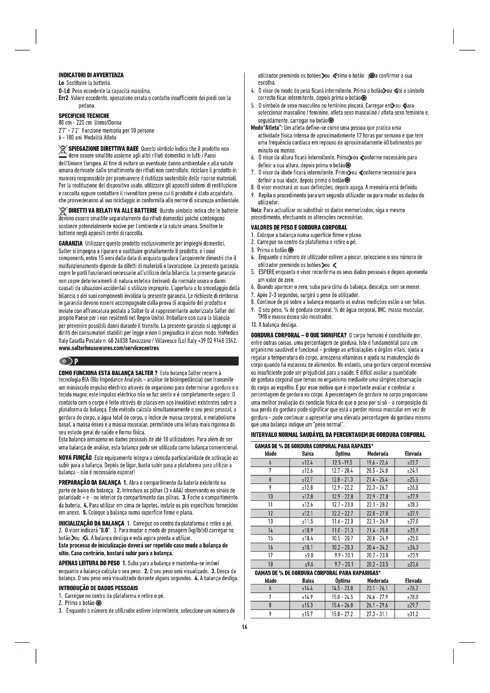 Exactamente, como é que a minha gordura corporal e água no organismo estão a ser avaliadas? Esta balança Salter utiliza um método de medição conhecido como Análise da Impedância Bioeléctrica (BIA). É enviado um impulso mínimo através do corpo, que passa pelos pés e pelas pernas. Esta corrente flui facilmente pelo tecido muscular magro, que é rico em teor de fluidos, mas tem dificuldade para fluir pela gordura. Por conseguinte, ao avaliar a impedância do seu organismo (i.e., a sua resistência à corrente), é possível determinar-se a quantidade de músculo. Com base nessa medição, é possível fazer uma estimativa da quantidade de gordura e de água. Qual é o valor da corrente que passa pelo meu corpo quando se efectua uma medição? É seguro? A corrente é inferior a 1mA, o que é um valor ínfimo e completamente seguro. A corrente não se sente. No entanto, convém salientar que, como medida de precaução para não danificar o dispositivo, este equipamento não deve ser utilizado por pessoas que tenham algum equipamento médico electrónico interno, como por exemplo um pacemaker. Se eu avaliar a minha gordura corporal e a água a horas diferentes durante o dia, os valores podem apresentar variações significativas. Qual o valor correcto? Os valores da sua percentagem de gordura corporal variam com o teor de água no organismo, que sofre variações ao longo do dia. Não há uma hora certa ou errada para efectuar uma avaliação, mas recomendamos que a faça a uma hora regular em que considerar que o seu organismo está normalmente hidratado. Evite efectuar avaliações depois de tomar banho ou ir à sauna, após exercício intenso, ou no período de 1-2 horas depois de ingerir grandes quantidades de água ou das refeições. Um amigo tem um analisador de gordura corporal de outro fabricante. Quando o utilizei, verifiquei que eu tinha um valor de gordura corporal diferente. Qual é a explicação? Analisadores de gordura corporal diferentes efectuam avaliações em diferentes partes do organismo e utilizam algoritmos matemáticos diferentes para calcular a percentagem de gordura corporal. O melhor conselho é não fazer comparações entre equipamentos, mas antes utilizar sempre o mesmo equipamento para controlar qualquer alteração. Como é que interpreto os meus valores de gordura corporal e de percentagem de água no organismo? Consulte as tabelas de gordura corporal e de água no organismo que acompanham o equipamento. Essas tabelas ajudam-no a perceber se os valores da sua gordura corporal e água no organismo se enquadram numa categoria saudável (relativamente à sua idade e sexo). Como devo proceder se os meus valores de gordura corporal forem muito “altos”? Uma dieta sensata, ingestão de líquidos e um programa de exercício físico podem reduzir a sua percentagem de gordura corporal. Deve procurar-se sempre orientação médica profissional antes de se iniciar um programa com estas características. Por que motivo é que os limites de percentagem de gordura corporal são diferentes para homens e mulheres? É natural que as mulheres tenham uma maior percentagem de gordura do que os homens, pois a constituição do corpo é diferente, estando preparado para a gravidez, amamentação, etc. Como devo proceder se os meus valores de percentagem de água forem “baixos”? Certifique-se de que bebe água suficiente com regularidade e esforce-se por integrar a sua percentagem de gordura no limite saudável. Por que motivo devo evitar a utilização da Balança de Análise Corporal Salter durante a gravidez? Durante a gravidez, a composição do organismo das mulheres sofre consideráveis alterações para suportar o feto em desenvolvimento. Nestas circunstâncias, os valores da percentagem de gordura corporal podem ser pouco precisos e induzir em erro. Por conseguinte, as mulheres grávidas deverão utilizar apenas a função de peso. RECOMENDAÇÕES DE UTILIZAÇÃO E CUIDADOS • Pese-se sempre na mesma balança posicionada na mesma superfície. Não compare os pesos obtidos em diferentes balanças, já que se verificarão algumas diferenças devido às tolerâncias de fabrico. • Ao colocar a balança numa superfície firme e plana garantirá o melhor rigor e consistência. • Para obter os resultados mais consistentes, recomenda-se que efectue as avaliações à mesma hora do dia, de preferência ao final da tarde, antes das refeições. • A balança faz arredondamentos para o valor mais aproximado. Caso se pese duas vezes e obtenha dois valores diferentes, o seu peso situa-se entre esses dois valores. • Limpe a balança com um pano húmido. Não utilize produtos de limpeza químicos. • Não encharque a balança com água pois pode danificar os componentes electrónicos. • Trate a balança com cuidado, pois trata-se de um instrumento de precisão. Não a deixe cair nem salte para cima da plataforma. GUIA DE RESOLUÇÃO DE PROBLEMAS • Quando utilizar as avaliações para a gordura corporal e água total no organismo, deve ter os pés descalços. • O estado da pele das plantas dos pés pode afectar a avaliação. Para obter os resultados mais rigorosos e consistentes, limpe os pés com um pano húmido, deixando-os ligeiramente humedecidos antes de subir para a balança.