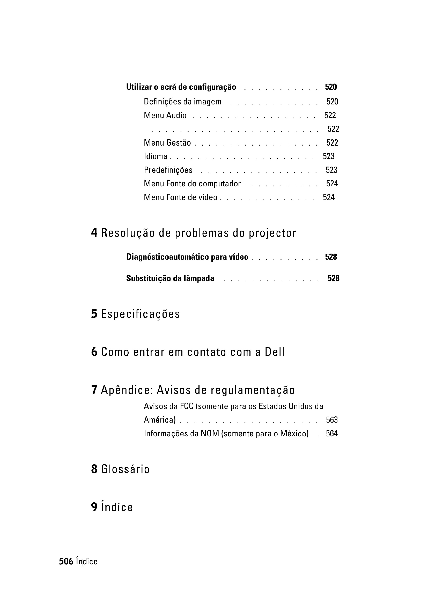 Ecrã de configuração 520 Menu Audio 522 Menu Computer Source 524 Menu Factory Reset 523 Menu Language 523 Menu Management 522 Menu Video Source 524 Especificações Áudio 532 Compatibilidade de vídeo 531 Condições ambientais 532 Conectores de entrada/saída 532 Consumo de energia 532 Dimensões 532 Distância de projecção 531 Fonte de alimentação 532 Frequência horizontal 532 Frequência vertical 532 Lâmpada 531 Lente de projecção 531 Luminosidade 531 Modos de compatibilidade 533 Nível de ruído 532 Peso 532 Quantidade de pixels 531 Regulamentação 532 Relação de contraste 531 Reprodução de cores 531 Tamanho do ecrã de projecção 531 Uniformidade 531 Válvula de luz 531 Velocidade da roda de cores 531