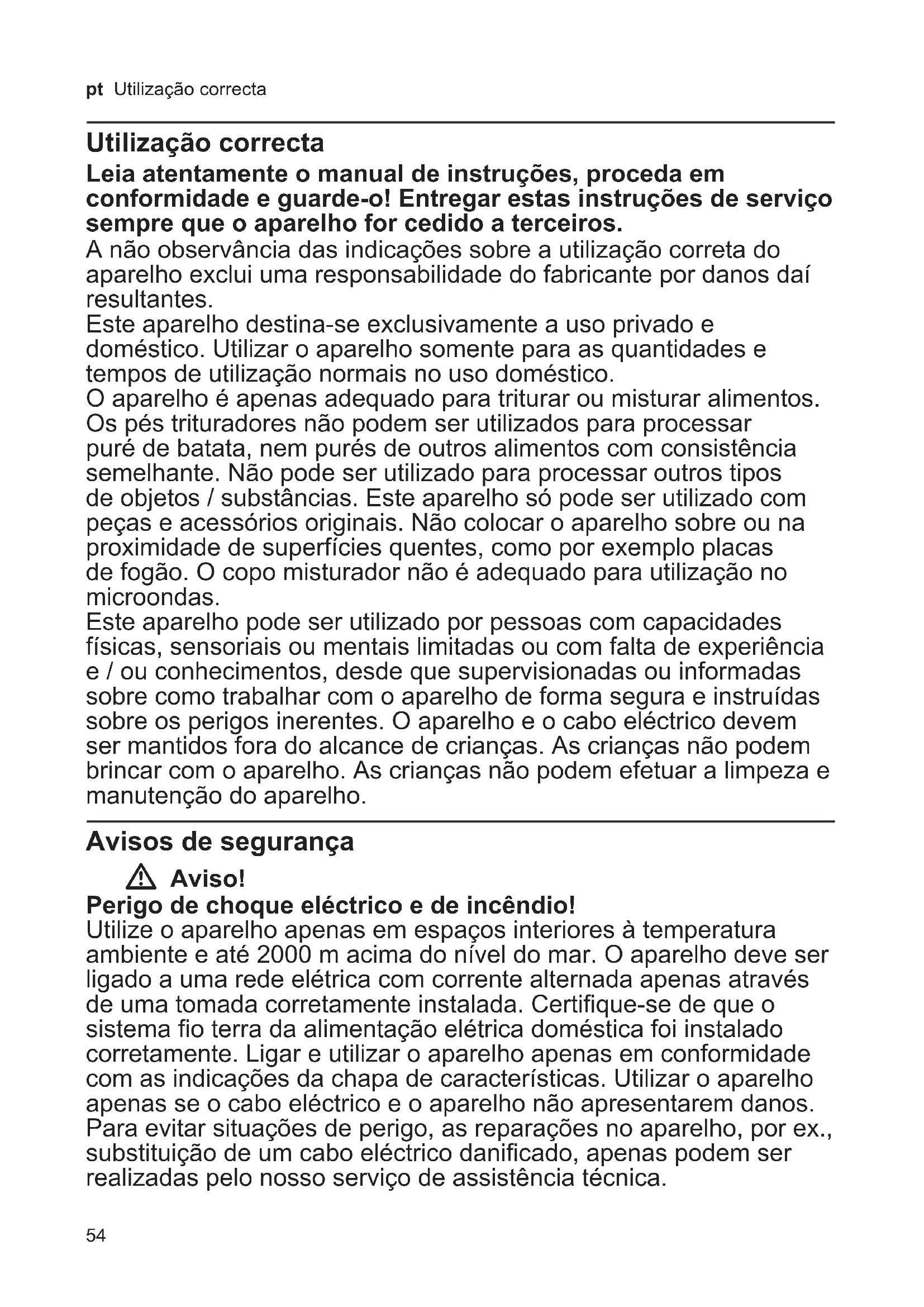 COMPRA. Todos nuestros técnicos van provistos del correspondiente carnet avalado por ANFEL (Asociación Nacional de Fabricantes de Elec- trodomésticos) que le acredita como Servicio Autorizado de Bosch. Reservado el derecho a cambios y modifi caciones sin previo aviso.54 pt Utilização correcta Utilização correcta Leia atentamente o manual de instruções, proceda em conformidade e guarde-o! Entregar estas instruções de serviço sempre que o aparelho for cedido a terceiros. A não observância das indicações sobre a utilização correta do aparelho exclui uma responsabilidade do fabricante por danos daí resultantes. Este aparelho destina-se exclusivamente a uso privado e doméstico. Utilizar o aparelho somente para as quantidades e tempos de utilização normais no uso doméstico. O aparelho é apenas adequado para triturar ou misturar alimentos. Os pés trituradores não podem ser utilizados para processar puré de batata, nem purés de outros alimentos com consistência semelhante. Não pode ser utilizado para processar outros tipos de objetos / substâncias. Este aparelho só pode ser utilizado com peças e acessórios originais. Não colocar o aparelho sobre ou na proximidade de superfícies quentes, como por exemplo placas de fogão. O copo misturador não é adequado para utilização no microondas. Este aparelho pode ser utilizado por pessoas com capacidades físicas, sensoriais ou mentais limitadas ou com falta de experiência e / ou conhecimentos, desde que supervisionadas ou informadas sobre como trabalhar com o aparelho de forma segura e instruídas sobre os perigos inerentes. O aparelho e o cabo eléctrico devem ser mantidos fora do alcance de crianças. As crianças não podem brincar com o aparelho. As crianças não podem efetuar a limpeza e manutenção do aparelho. Avisos de segurança W Aviso! Perigo de choque eléctrico e de incêndio! Utilize o aparelho apenas em espaços interiores à temperatura ambiente e até 2000 m acima do nível do mar. O aparelho deve ser ligado a uma rede elétrica com corrente alternada apenas através de uma tomada corretamente instalada. Certifique-se de que o sistema fio terra da alimentação elétrica doméstica foi instalado corretamente. Ligar e utilizar o aparelho apenas em conformidade com as indicações da chapa de características. Utilizar o aparelho apenas se o cabo eléctrico e o aparelho não apresentarem danos. Para evitar situações de perigo, as reparações no aparelho, por ex., substituição de um cabo eléctrico danificado, apenas podem ser realizadas pelo nosso serviço de assistência técnica.55