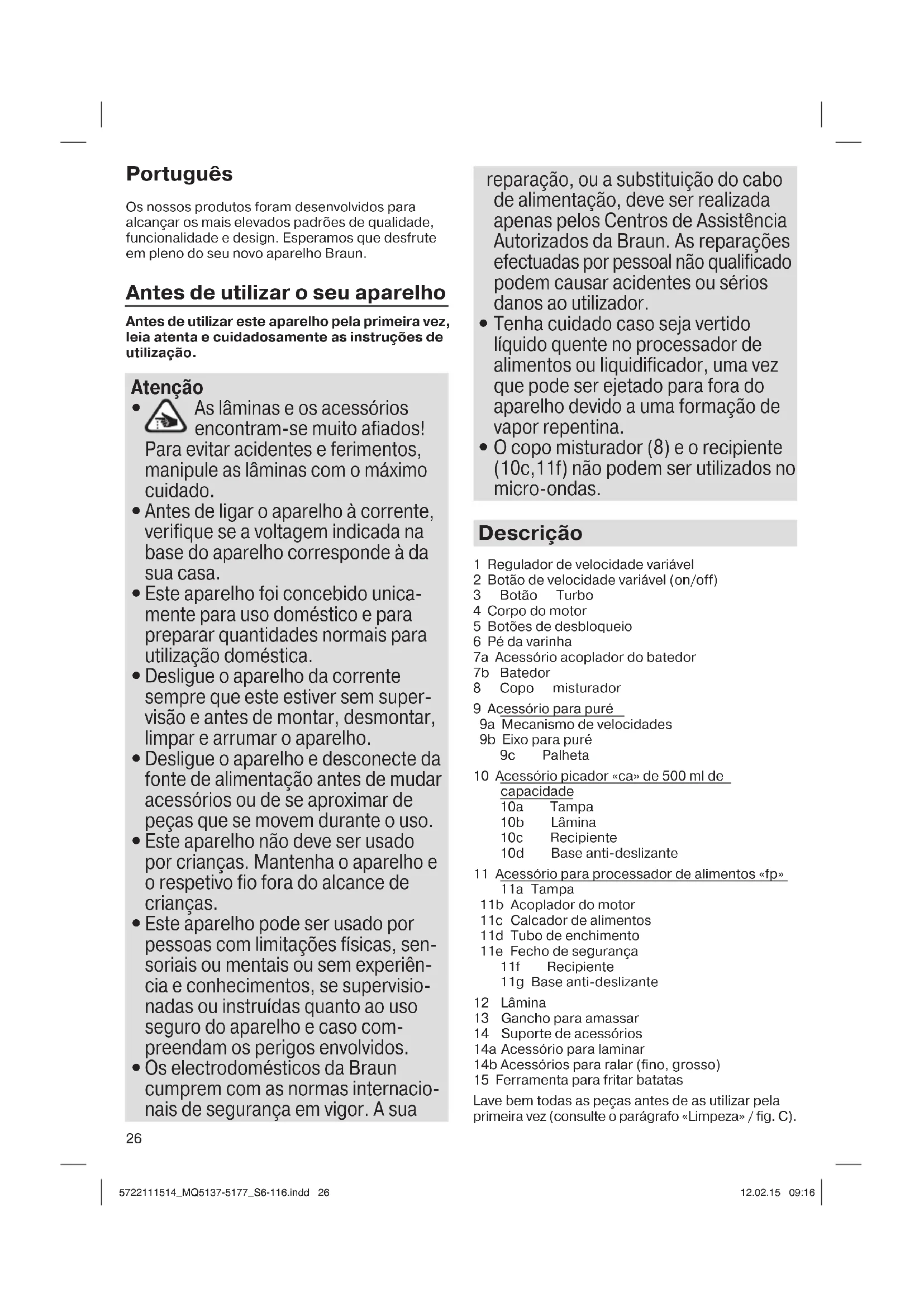 - Continue a reduzir a puré durante cerca de 30 s Limpeza (C) Limpe a peça do motor (4), os mecanismos de velocidades (7a,9a) apenas com um pano húmido. As tampas podem ser limpas com água corrente, mas não as submerja em água nem as lave numa máquina de lavar loiça. Todas as restantes peças podem ser lavadas numa máquina de lavar loiça. Se os alimentos tiverem secado no acessório para puré, remova a palheta. Molhe a palheta e a base 5722111514_MQ5137-5177_S6-116.indd 295722111514_MQ5137-5177_S6-116.indd 29 12.02.15 09:1612.02.15 09:1630 do eixo do acessório para puré em água quente para amolecer e de seguida lave bem. Pode retirar as bases anti-deslizantes dos recipientes do picador para uma melhor limpeza. Quando se preparam alimentos de cores intensas (como cenouras, por exemplo), as peças de plástico podem ficar manchadas. Limpe estas peças com óleo vegetal alimentar antes de as lavar. Acessórios (podem ser comprados individualmente, não disponível em todos os países) MQ 10: Batedor para preparar chantilly, bater claras em castelo e sobremesas instantâneas de pacote MQ 20: Acessório picador de 350 ml de capacidade, para picar ervas aromáticas, cebolas, alho, malaguetas, frutos secos, etc MQ 30: Acessório picador de 500 ml de capacidade, para picar cenouras, carne, cebolas, etc. MQ 40: Acessório picador de 1250 ml de capacidade, para picar, misturar, liquidificar e triturar gelo MQ 50: Acessório para puré para fazer puré de legumes e batatas cozidos MQ 70: Acessório para processador de alimentos para picar, misturar, amassar e triturar Sujeito a alterações sem aviso prévio. Não deite o produto no lixo doméstico no final da sua vida útil. Poderá entregá-lo num Centro de Assistência da Braun ou num dos pontos de recolha ou reciclagem previsto para esse efeito. 5722111514_MQ5137-5177_S6-116.indd 305722111514_MQ5137-5177_S6-116.indd 30 12.02.15 09:1612.02.15 09:1631 Italiano I nostri prodotti sono progettati per soddisfare gli standard più elevati in termini di qualità, funzionalità e design. Ci auguriamo che l’elettrodomestico Braun soddisfi appieno le vostre esigenze. Prima dell’utilizzo Prima di usare il prodotto, leggere attentamente e interamente le istruzioni. Attenzione
