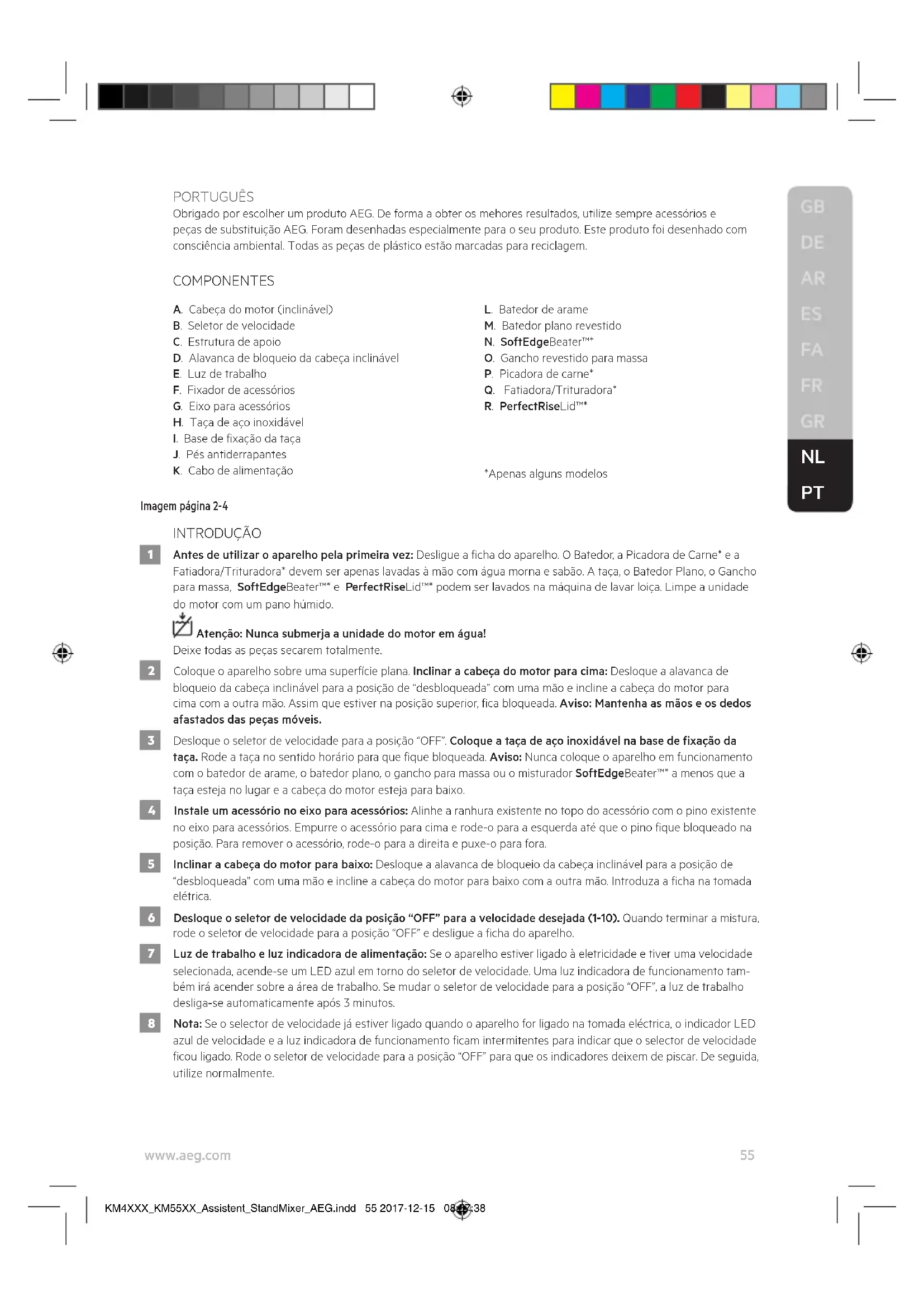 - Evite o contacto com as peças móveis. Isso pode resultar em ferimentos! Não utilize KM4XXX_KM55XX_Assistent_StandMixer_AEG.indd 57 2017-12-15 08:57:3958 www.aeg.com outras ferramentas ou outros utensílios enquanto estiver a utilizar este aparelho.