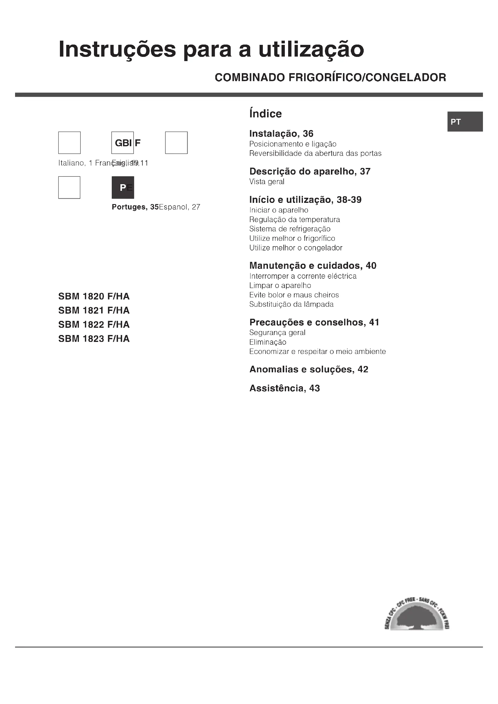 Índice Instalação, 36 Posicionamento e ligação Reversibilidade da abertura das portas Descrição do aparelho, 37 Vista geral Início e utilização, 38-39 Iniciar o aparelho Regulação da temperatura Sistema de refrigeração Utilize melhor o frigorífico Utilize melhor o congelador Manutenção e cuidados, 40 Interromper a corrente eléctrica Limpar o aparelho Evite bolor e maus cheiros Substituição da lâmpada Precauções e conselhos, 41 Segurança geral Eliminação Economizar e respeitar o meio ambiente Anomalias e soluções, 42 Assistência, 4336
