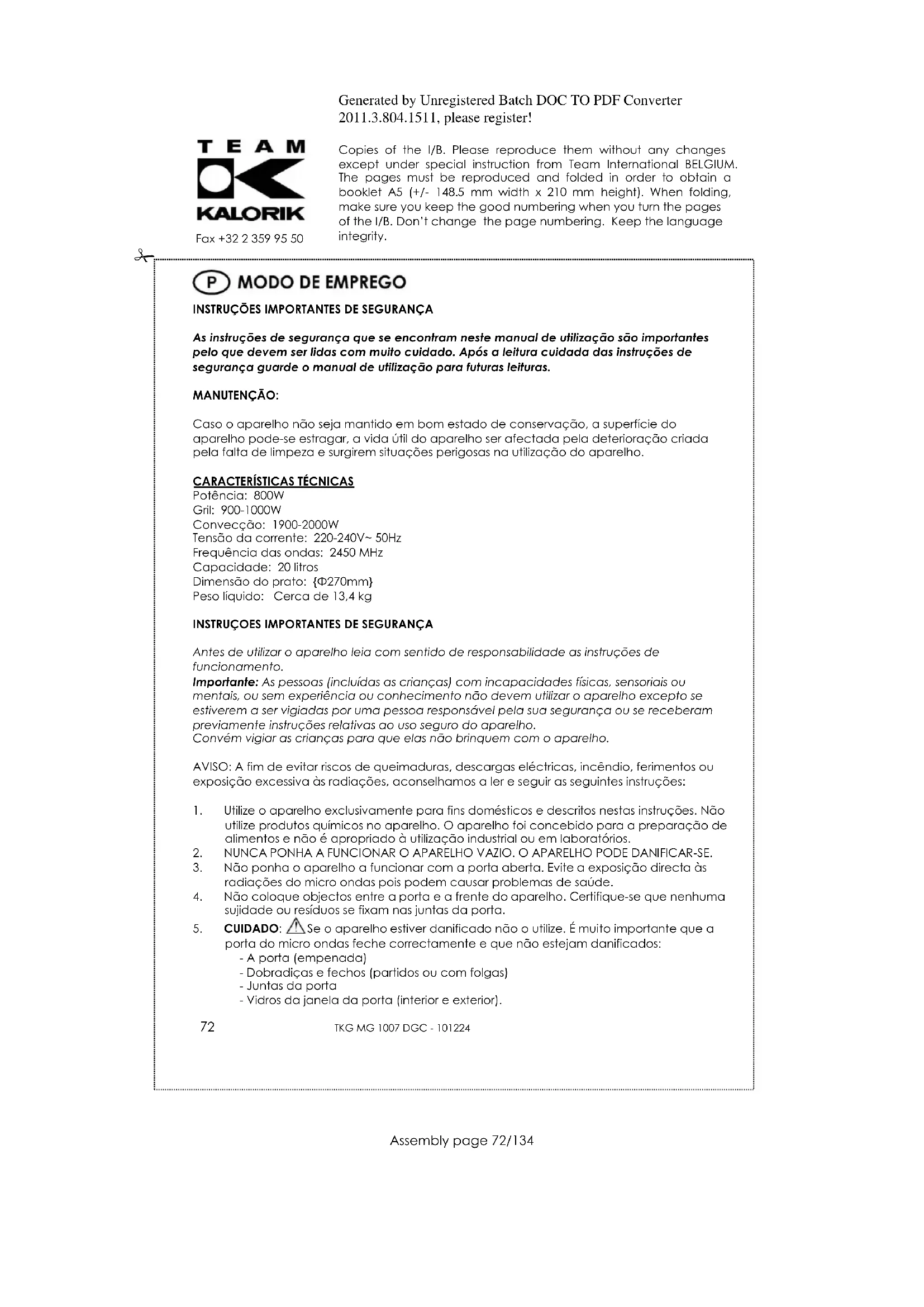 Resíduos próprios da fabricação ou de óleo podem provocar um ligeiro cheiro ou fumo quando utilizar o aparelho por primeira vez. Este procedimento é normal, e não afeta o desempenho do seu aparelho. Se mantiver a porta aberta para proporcionar uma ventilação adequada, esses resíduos devem desaparecer depois de alguns usos. A fim de eliminar estes resíduos, próprios da fabricação, aconselhamos a que utilize o microondas, no modo grelhador ou no modo convencional, algumas vezes cerca de 30 segundos sem comida dentro. Atenção: não deve utilizar o microondas no modo combinado, sem alimentos.Generated by Unregistered Batch DOC TO PDF Converter 2011.3.804.1511, please register! Copies of the I/B. Please reproduce them without any changes except under special instruction from Team International BELGIUM. The pages must be reproduced and folded in order to obtain a booklet A5 (+/- 148.5 mm width x 210 mm height). When folding, make sure you keep the good numbering when you turn the pages of the I/B. Don‟t change the page numbering. Keep the language integrity.