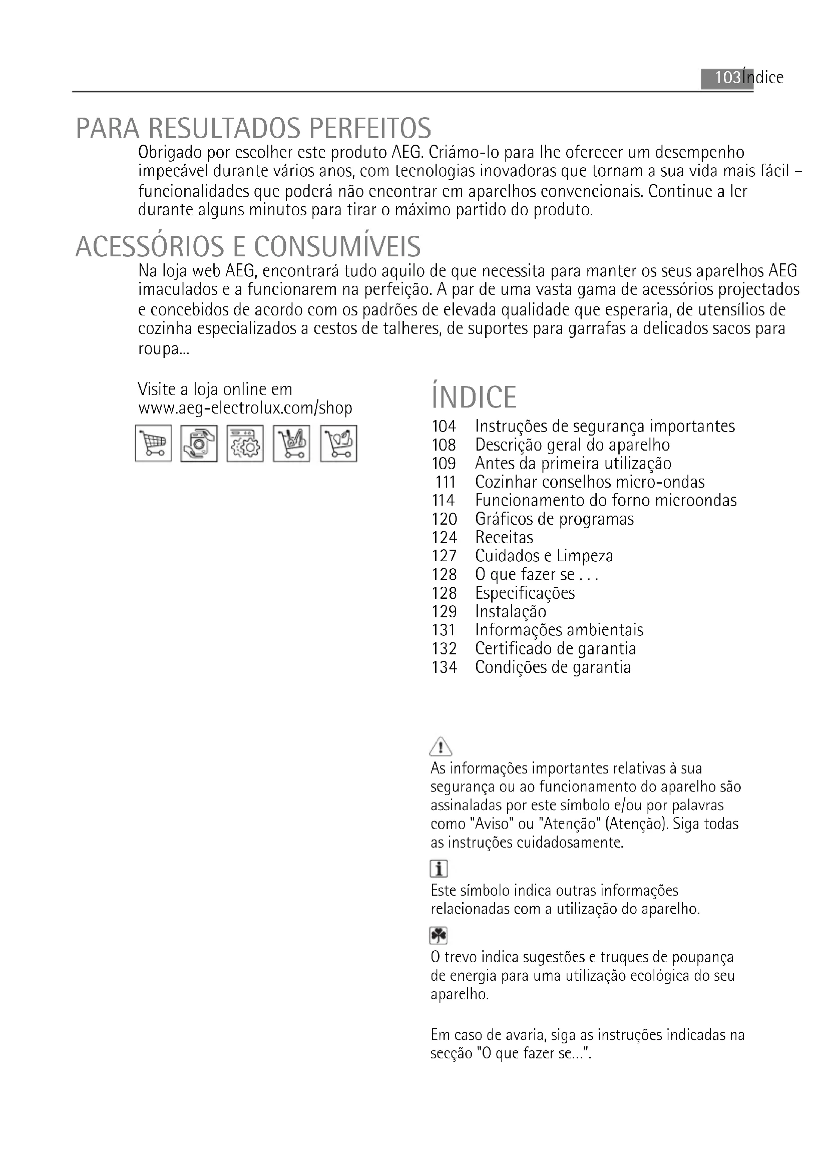 Na loja web AEG, encontrará tudo aquilo de que necessita para manter os seus aparelhos AEG imaculados e a funcionarem na perfeição. A par de uma vasta gama de acessórios projectados e concebidos de acordo com os padrões de elevada qualidade que esperaria, de utensílios de cozinha especializados a cestos de talheres, de suportes para garrafas a delicados sacos para roupa... As informações importantes relativas à sua segurança ou ao funcionamento do aparelho são assinaladas por este símbolo e/ou por palavras como "Aviso" ou "Atenção" (Atenção). Siga todas as instruções cuidadosamente. Este símbolo indica outras informações relacionadas com a utilização do aparelho. O trevo indica sugestões e truques de poupança de energia para uma utilização ecológica do seu aparelho. Em caso de avaria, siga as instruções indicadas na secção "O que fazer se…". ÍNDICE Visite a loja online em www.aeg-electrolux.com/shop