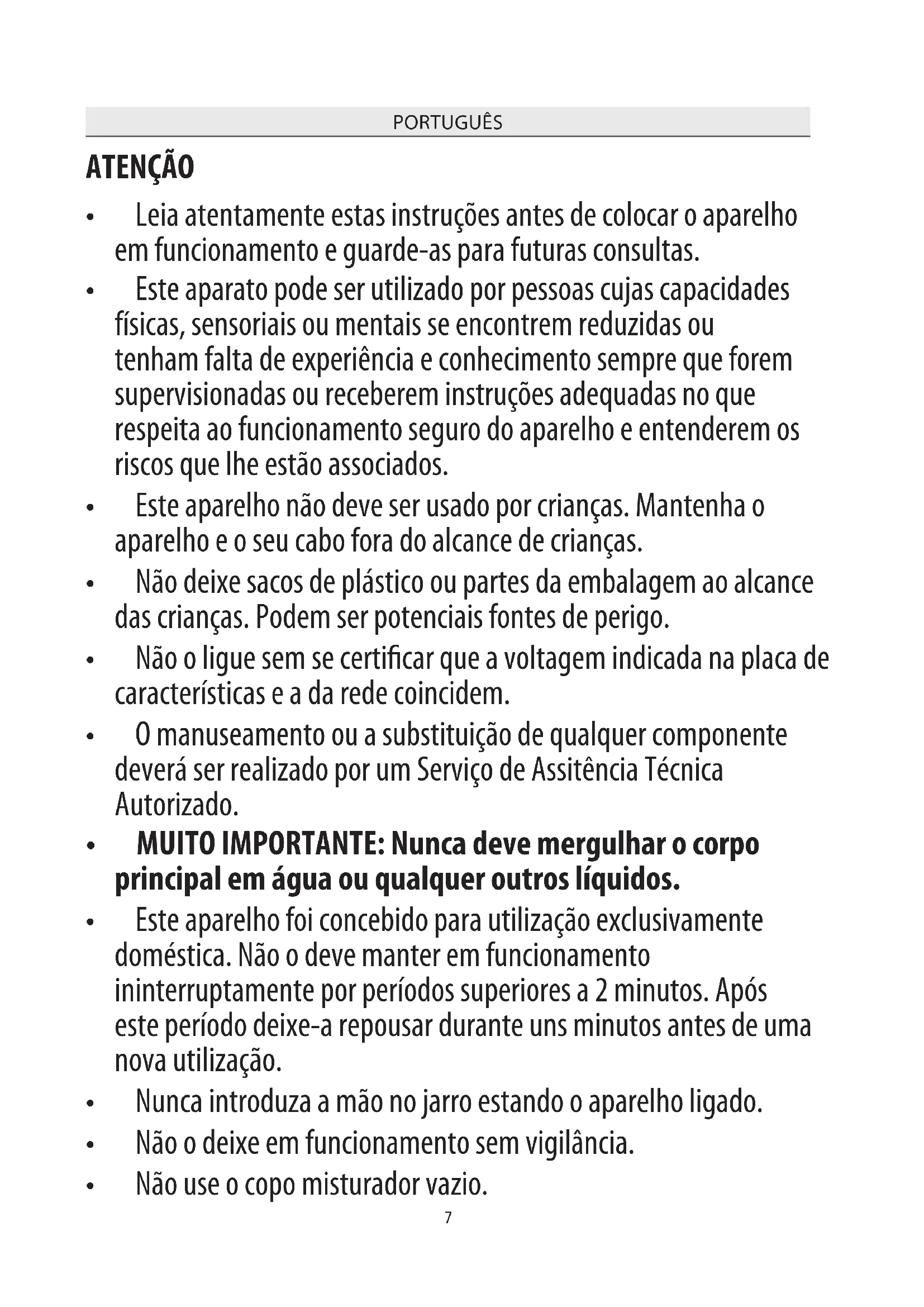 - Este aparelho foi concebido para utilização exclusivamente doméstica. Não o deve manter em funcionamento ininterruptamente por períodos superiores a 2 minutos. Após este período deixe-a repousar durante uns minutos antes de uma nova utilização.