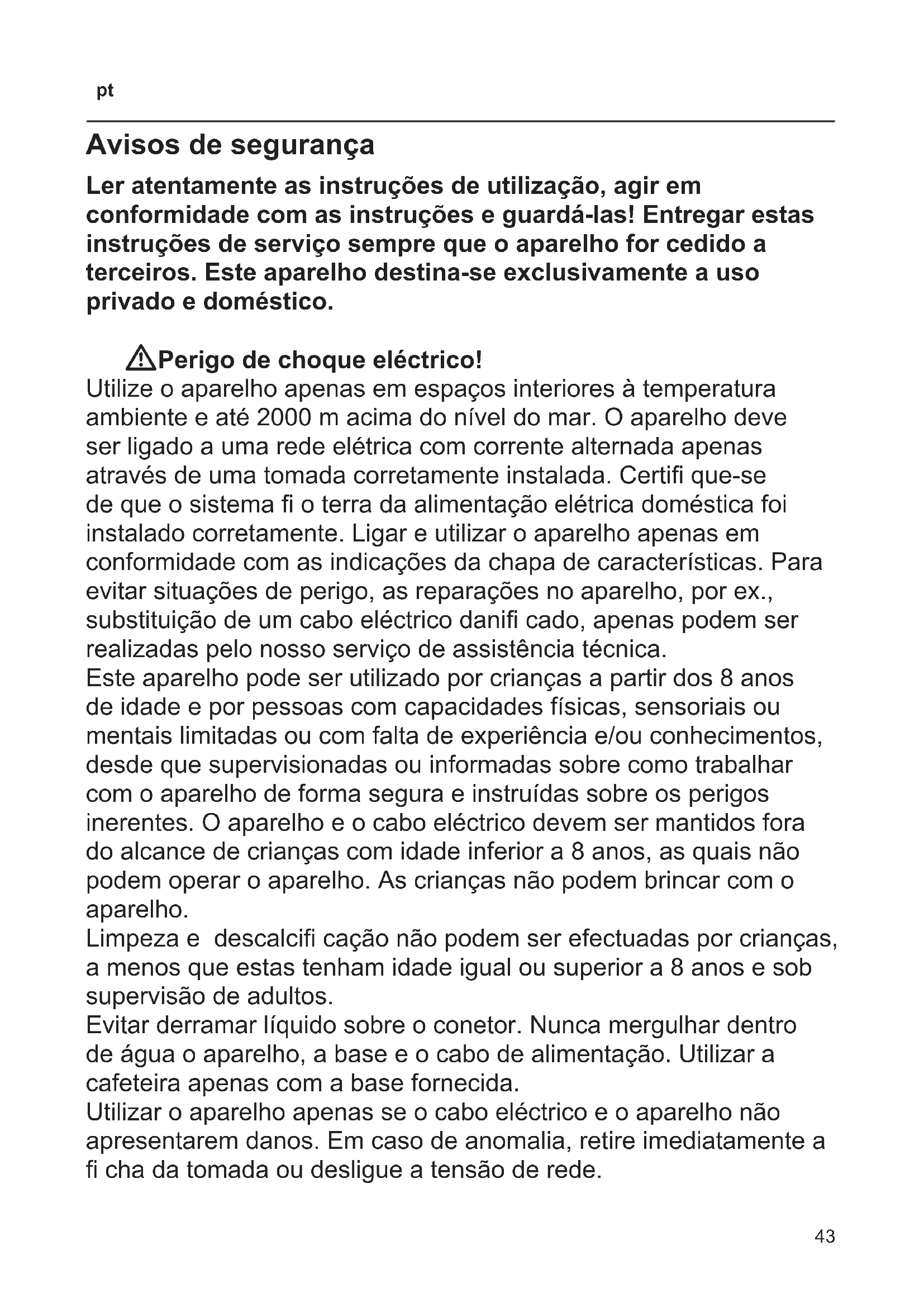Avisos de segurança Ler atentamente as instruções de utilização, agir em conformidade com as instruções e guardá-las! Entregar estas instruções de serviço sempre que o aparelho for cedido a terceiros. Este aparelho destina-se exclusivamente a uso privado e doméstico. WPerigo de choque eléctrico! Utilize o aparelho apenas em espaços interiores à temperatura ambiente e até 2000 m acima do nível do mar. O aparelho deve ser ligado a uma rede elétrica com corrente alternada apenas através de uma tomada corretamente instalada. Certi que-se de que o sistema o terra da alimentação elétrica doméstica foi instalado corretamente. Ligar e utilizar o aparelho apenas em conformidade com as indicações da chapa de características. Para evitar situações de perigo, as reparações no aparelho, por ex., substituição de um cabo eléctrico dani cado, apenas podem ser realizadas pelo nosso serviço de assistência técnica. Este aparelho pode ser utilizado por crianças a partir dos 8 anos de idade e por pessoas com capacidades físicas, sensoriais ou mentais limitadas ou com falta de experiência e/ou conhecimentos, desde que supervisionadas ou informadas sobre como trabalhar com o aparelho de forma segura e instruídas sobre os perigos inerentes. O aparelho e o cabo eléctrico devem ser mantidos fora do alcance de crianças com idade inferior a 8 anos, as quais não podem operar o aparelho. As crianças não podem brincar com o aparelho. Limpeza e descalci cação não podem ser efectuadas por crianças, a menos que estas tenham idade igual ou superior a 8 anos e sob supervisão de adultos. Evitar derramar líquido sobre o conetor. Nunca mergulhar dentro de água o aparelho, a base e o cabo de alimentação. Utilizar a cafeteira apenas com a base fornecida. Utilizar o aparelho apenas se o cabo eléctrico e o aparelho não apresentarem danos. Em caso de anomalia, retire imediatamente a cha da tomada ou desligue a tensão de rede.44