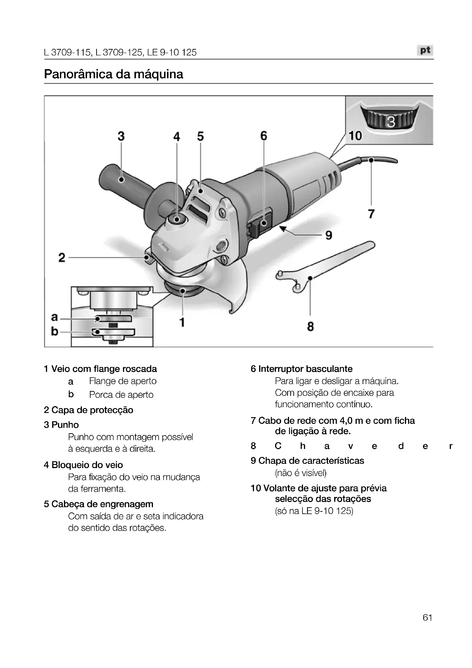 Porca de aperto 2 Capa de protecção 3 Punho Punho com montagem possível à esquerda e à direita. 4 Bloqueio do veio Para fixação do veio na mudança da ferramenta. 5 Cabeça de engrenagem Com saída de ar e seta indicadora do sentido das rotações. 6 Interruptor basculante Para ligar e desligar a máquina. Com posição de encaixe para funcionamento contínuo. 7 Cabo de rede com 4,0 m e com ficha de ligação à rede. 8Chave de retenção 9 Chapa de características (não é visível) 10 Volante de ajuste para prévia selecção das rotações (só na LE 9-10 125)L 3709-115, L 3709-125, LE 9-10 125