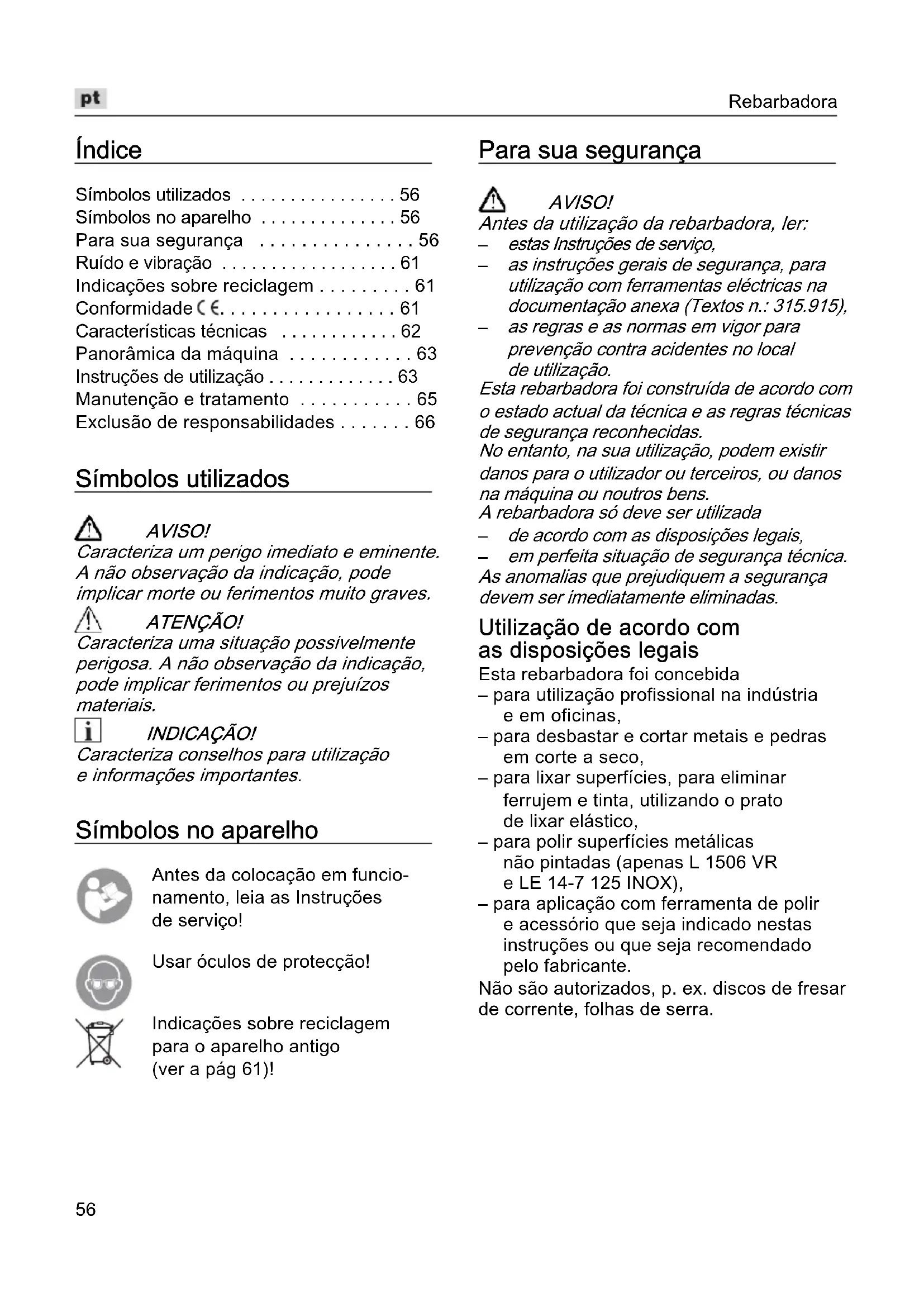 - Exclusão de responsabilidades Símbolos utilizados AVISO! Caracteriza um perigo imediato e eminente. A não observação da indicação, pode implicar morte ou ferimentos muito graves. ATENÇÃO! Caracteriza uma situação possivelmente perigosa. A não observação da indicação, pode implicar ferimentos ou prejuízos materiais. INDICAÇÃO! Caracteriza conselhos para utilização e informações importantes. Símbolos no aparelho Antes da colocação em funcio- namento, leia as Instruções de serviço! Usar óculos de protecção! Indicações sobre reciclagem para o aparelho antigo (ver a pág 61)! Para sua segurança AVISO! Antes da utilização da rebarbadora, ler: p. 66