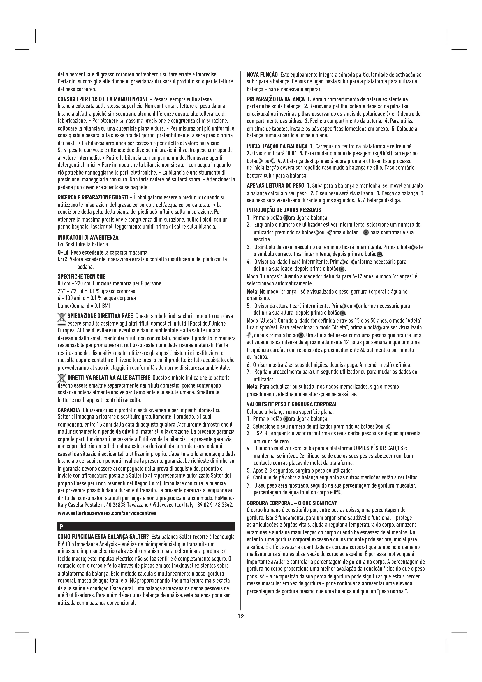 m14 ou no período de 1-2 horas depois de ingerir grandes quantidades de água ou das refeições. Um amigo tem um analisador de gordura corporal de outro fabricante. Quando o utilizei, verifiquei que eu tinha um valor de gordura corporal diferente. Qual é a explicação? Analisadores de gordura corporal diferentes efectuam avaliações em diferentes partes do organismo e utilizam algoritmos matemáticos diferentes para calcular a percentagem de gordura corporal. O melhor conselho é não fazer comparações entre equipamentos, mas antes utilizar sempre o mesmo equipamento para controlar qualquer alteração. Como é que interpreto os meus valores de gordura corporal e de percentagem de água no organismo? Consulte as tabelas de gordura corporal e de água no organismo que acompanham o equipamento. Essas tabelas ajudam-no a perceber se os valores da sua gordura corporal e água no organismo se enquadram numa categoria saudável (relativamente à sua idade e sexo). Como devo proceder se os meus valores de gordura corporal forem muito “altos”? Uma dieta sensata, ingestão de líquidos e um programa de exercício físico podem reduzir a sua percentagem de gordura corporal. Deve procurar-se sempre orientação médica profissional antes de se iniciar um programa com estas características. Por que motivo é que os limites de percentagem de gordura corporal são diferentes para homens e mulheres? É natural que as mulheres tenham uma maior percentagem de gordura do que os homens, pois a constituição do corpo é diferente, estando preparado para a gravidez, amamentação, etc. Como devo proceder se os meus valores de percentagem de água forem “baixos”? Certifique-se de que bebe água suficiente com regularidade e esforce-se por integrar a sua percentagem de gordura no limite saudável. Por que motivo devo evitar a utilização da Balança de Análise Corporal Salter durante a gravidez? Durante a gravidez, a composição do organismo das mulheres sofre consideráveis alterações para suportar o feto em desenvolvimento. Nestas circunstâncias, os valores da percentagem de gordura corporal podem ser pouco precisos e induzir em erro. Por conseguinte, as mulheres grávidas deverão utilizar apenas a função de peso. RECOMENDAÇÕES DE UTILIZAÇÃO E CUIDADOS • Pese-se sempre na mesma balança posicionada na mesma superfície. Não compare os pesos obtidos em diferentes balanças, já que se verificarão algumas diferenças devido às tolerâncias de fabrico. • Ao colocar a balança numa superfície firme e plana garantirá o melhor rigor e consistência. • Para obter os resultados mais consistentes, recomenda-se que efectue as avaliações à mesma hora do dia, de preferência ao final da tarde, antes das refeições. • A balança faz arredondamentos para o valor mais aproximado. Caso se pese duas vezes e obtenha dois valores diferentes, o seu peso situa-se entre esses dois valores. • Limpe a balança com um pano húmido. Não utilize produtos de limpeza químicos. • Não encharque a balança com água pois pode danificar os componentes electrónicos. • Trate a balança com cuidado, pois trata-se de um instrumento de precisão. Não a deixe cair nem salte para cima da plataforma.