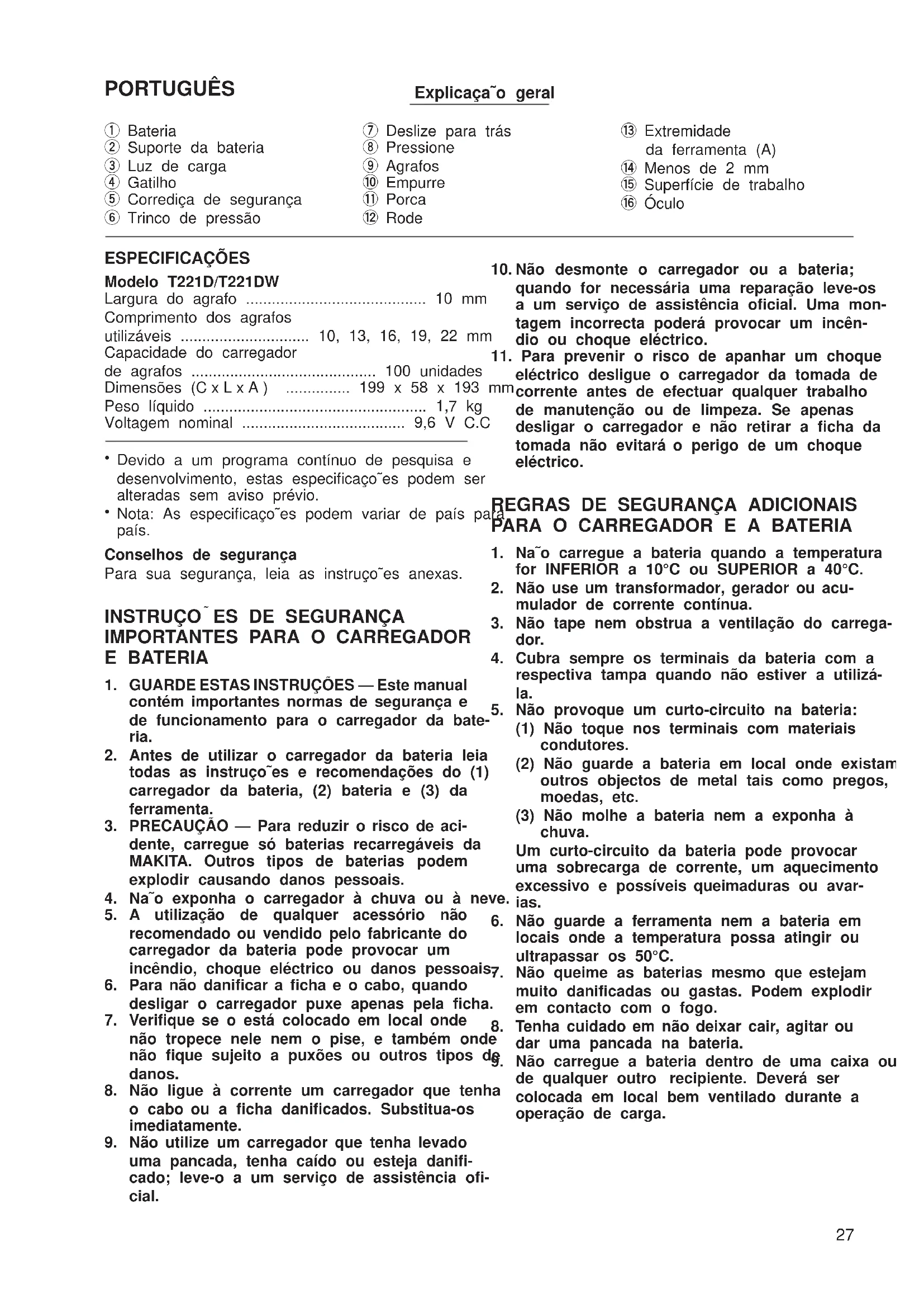 - T221D (Sp) (’100. 3. 17)PORTUGUÊS Explicaça˜o geral 1 Bateria 2 Suporte da bateria 3 Luz de carga 4 Gatilho 5 Corrediça de segurança 6 Trinco de pressão 7 Deslize para trás 8 Pressione 9 Agrafos 0 Empurre q Porca w Rode e Extremidade da ferramenta (A) r Menos de 2 mm t Superfície de trabalho y Óculo ESPECIFICAÇÕES Modelo T221D/T221DW Largura do agrafo p. 10