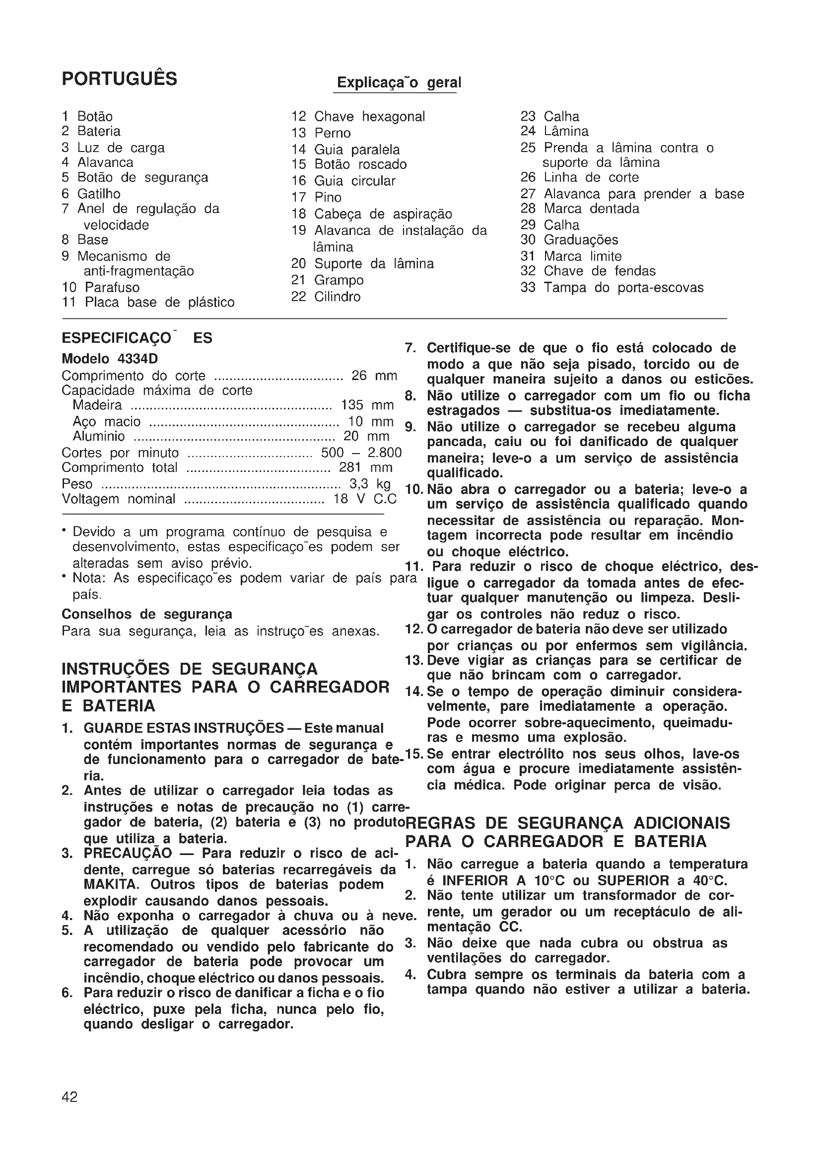 PORTUGUÊS Ruído e Vibração do Modelo 4334D Os níveis normais de ruído A são nível de pressão de som: 85 dB (A) nível do sum: 98 dB (A) – Utilize protectores para os ouvidos – O valor médio da aceleração é 6 m/s