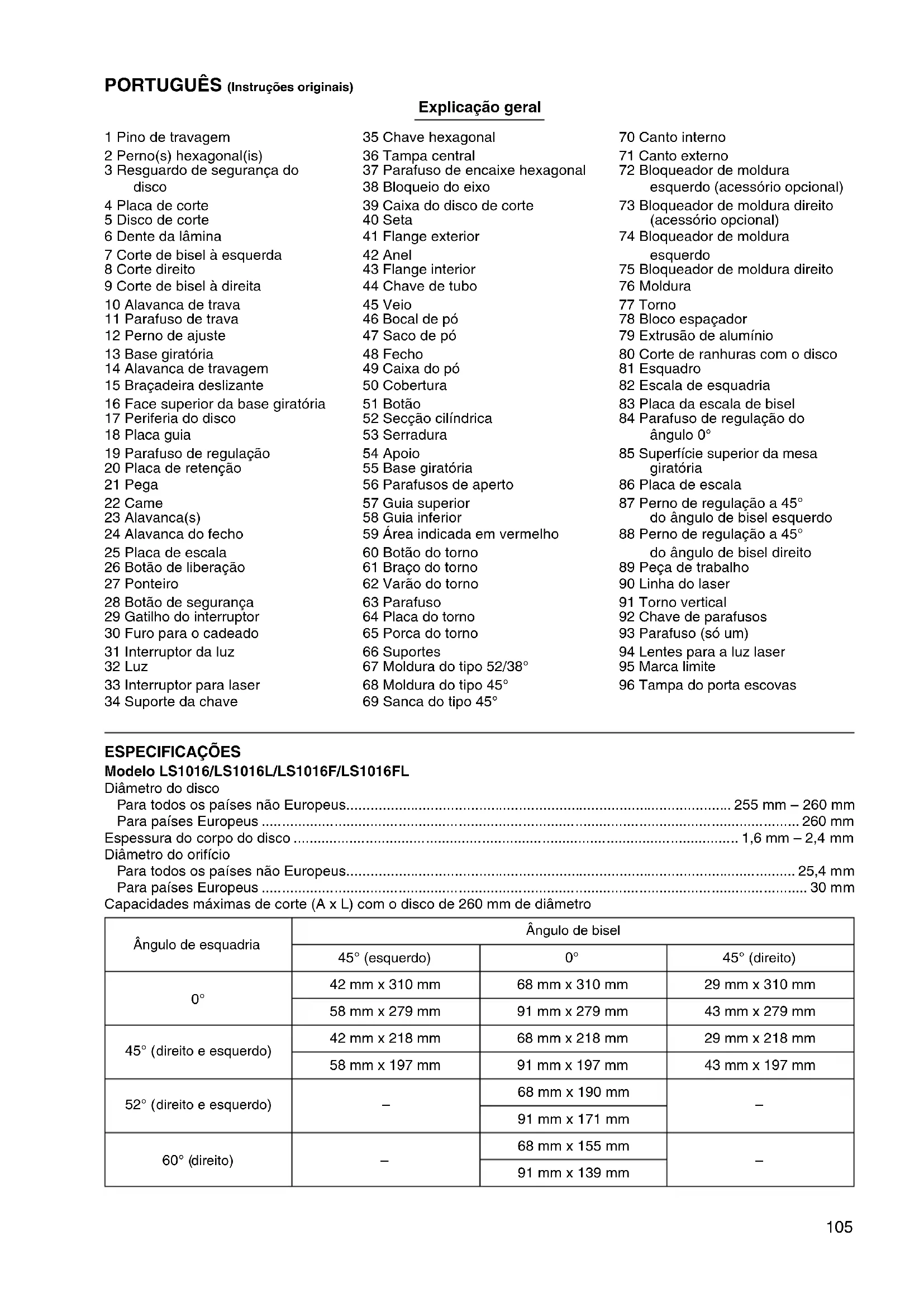 - Tomoyasu Kato Director Makita Corporation 3-11-8, Sumiyoshi-cho, Anjo, Aichi, 446-8502, JAPAN105 PORTUGUÊS (Instruções originais) Explicação geral 1 Pino de travagem 2 Perno(s) hexagonal(is) 3 Resguardo de segurança do disco 4 Placa de corte 5 Disco de corte 6 Dente da lâmina 7 Corte de bisel à esquerda 8 Corte direito 9 Corte de bisel à direita 10 Alavanca de trava 11 Parafuso de trava 12 Perno de ajuste 13 Base giratória 14 Alavanca de travagem 15 Braçadeira deslizante 16 Face superior da base giratória 17 Periferia do disco 18 Placa guia 19 Parafuso de regulação 20 Placa de retenção 21 Pega 22 Came 23 Alavanca(s) 24 Alavanca do fecho 25 Placa de escala 26 Botão de liberação 27 Ponteiro 28 Botão de segurança 29 Gatilho do interruptor 30 Furo para o cadeado 31 Interruptor da luz 32 Luz 33 Interruptor para laser 34 Suporte da chave 35 Chave hexagonal 36 Tampa central 37 Parafuso de encaixe hexagonal 38 Bloqueio do eixo 39 Caixa do disco de corte 40 Seta 41 Flange exterior 42 Anel 43 Flange interior 44 Chave de tubo 45 Veio 46 Bocal de pó 47 Saco de pó 48 Fecho 49 Caixa do pó 50 Cobertura 51 Botão 52 Secção cilíndrica 53 Serradura 54 Apoio 55 Base giratória 56 Parafusos de aperto 57 Guia superior 58 Guia inferior 59 Área indicada em vermelho 60 Botão do torno 61 Braço do torno 62 Varão do torno 63 Parafuso 64 Placa do torno 65 Porca do torno 66 Suportes 67 Moldura do tipo 52/38° 68 Moldura do tipo 45° 69 Sanca do tipo 45° 70 Canto interno 71 Canto externo 72 Bloqueador de moldura esquerdo (acessório opcional) 73 Bloqueador de moldura direito (acessório opcional) 74 Bloqueador de moldura esquerdo 75 Bloqueador de moldura direito 76 Moldura 77 Torno 78 Bloco espaçador 79 Extrusão de alumínio 80 Corte de ranhuras com o disco 81 Esquadro 82 Escala de esquadria 83 Placa da escala de bisel 84 Parafuso de regulação do ângulo 0° 85 Superfície superior da mesa giratória 86 Placa de escala 87 Perno de regulação a 45° do ângulo de bisel esquerdo 88 Perno de regulação a 45° do ângulo de bisel direito 89 Peça de trabalho 90 Linha do laser 91 Torno vertical 92 Chave de parafusos 93 Parafuso (só um) 94 Lentes para a luz laser 95 Marca limite 96 Tampa do porta escovas ESPECIFICAÇÕES Modelo LS1016/LS1016L/LS1016F/LS1016FL Diâmetro do disco Para todos os países não Europeus p. 255
