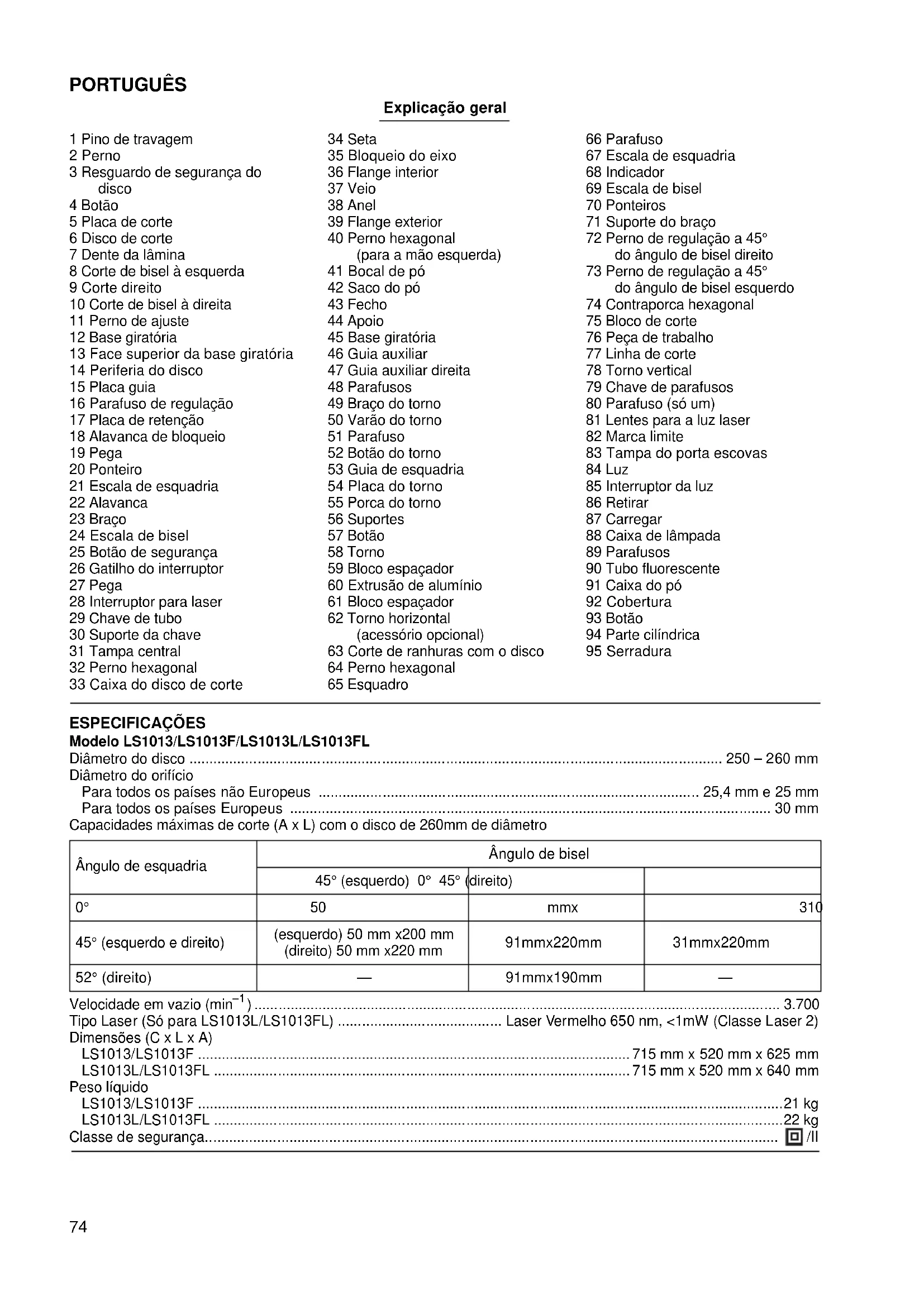 - Llave hexagonal (Para LS1013L/LS1013FL)74 PORTUGUÊS Explicação geral 1 Pino de travagem 2 Perno 3 Resguardo de segurança do disco 4 Botão 5 Placa de corte 6 Disco de corte 7 Dente da lâmina 8 Corte de bisel à esquerda 9 Corte direito 10 Corte de bisel à direita 11 Perno de ajuste 12 Base giratória 13 Face superior da base giratória 14 Periferia do disco 15 Placa guia 16 Parafuso de regulação 17 Placa de retenção 18 Alavanca de bloqueio 19 Pega 20 Ponteiro 21 Escala de esquadria 22 Alavanca 23 Braço 24 Escala de bisel 25 Botão de segurança 26 Gatilho do interruptor 27 Pega 28 Interruptor para laser 29 Chave de tubo 30 Suporte da chave 31 Tampa central 32 Perno hexagonal 33 Caixa do disco de corte 34 Seta 35 Bloqueio do eixo 36 Flange interior 37 Veio 38 Anel 39 Flange exterior 40 Perno hexagonal (para a mão esquerda) 41 Bocal de pó 42 Saco do pó 43 Fecho 44 Apoio 45 Base giratória 46 Guia auxiliar 47 Guia auxiliar direita 48 Parafusos 49 Braço do torno 50 Varão do torno 51 Parafuso 52 Botão do torno 53 Guia de esquadria 54 Placa do torno 55 Porca do torno 56 Suportes 57 Botão 58 Torno 59 Bloco espaçador 60 Extrusão de alumínio 61 Bloco espaçador 62 Torno horizontal (acessório opcional) 63 Corte de ranhuras com o disco 64 Perno hexagonal 65 Esquadro 66 Parafuso 67 Escala de esquadria 68 Indicador 69 Escala de bisel 70 Ponteiros 71 Suporte do braço 72 Perno de regulação a 45° do ângulo de bisel direito 73 Perno de regulação a 45° do ângulo de bisel esquerdo 74 Contraporca hexagonal 75 Bloco de corte 76 Peça de trabalho 77 Linha de corte 78 Torno vertical 79 Chave de parafusos 80 Parafuso (só um) 81 Lentes para a luz laser 82 Marca limite 83 Tampa do porta escovas 84 Luz 85 Interruptor da luz 86 Retirar 87 Carregar 88 Caixa de lâmpada 89 Parafusos 90 Tubo fluorescente 91 Caixa do pó 92 Cobertura 93 Botão 94 Parte cilíndrica 95 Serradura ESPECIFICAÇÕES Modelo LS1013/LS1013F/LS1013L/LS1013FL Diâmetro do disco ..................................................................................................................................... 250 – 260 mm Diâmetro do orifício Para todos os países não Europeus ............................................................................................... 25,4 mm e 25 mm Para todos os países Europeus ........................................................................................................................ 30 mm Capacidades máximas de corte (A x L) com o disco de 260mm de diâmetro Velocidade em vazio (min