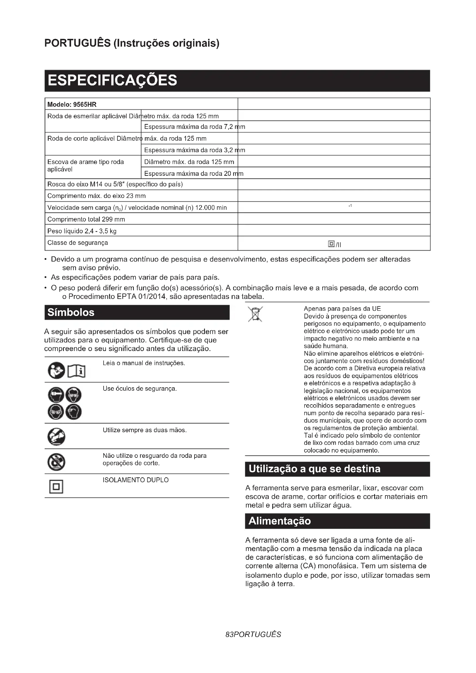 - O peso poderá diferir em função do(s) acessório(s). A combinação mais leve e a mais pesada, de acordo com o Procedimento EPTA 01/2014, são apresentadas na tabela. Símbolos A seguir são apresentados os símbolos que podem ser utilizados para o equipamento. Certique-se de que compreende o seu signicado antes da utilização. Leia o manual de instruções. Use óculos de segurança. Utilize sempre as duas mãos. Não utilize o resguardo da roda para operações de corte. ISOLAMENTO DUPLO Apenas para países da UE Devido à presença de componentes perigosos no equipamento, o equipamento elétrico e eletrónico usado pode ter um impacto negativo no meio ambiente e na saúde humana. Não elimine aparelhos elétricos e eletróni- cos juntamente com resíduos domésticos! De acordo com a Diretiva europeia relativa aos resíduos de equipamentos elétricos e eletrónicos e a respetiva adaptação à legislação nacional, os equipamentos elétricos e eletrónicos usados devem ser recolhidos separadamente e entregues num ponto de recolha separado para resí- duos municipais, que opere de acordo com os regulamentos de proteção ambiental. Tal é indicado pelo símbolo de contentor de lixo com rodas barrado com uma cruz colocado no equipamento. Utilização a que se destina A ferramenta serve para esmerilar, lixar, escovar com escova de arame, cortar orifícios e cortar materiais em metal e pedra sem utilizar água. Alimentação A ferramenta só deve ser ligada a uma fonte de ali- mentação com a mesma tensão da indicada na placa de características, e só funciona com alimentação de corrente alterna (CA) monofásica. Tem um sistema de isolamento duplo e pode, por isso, utilizar tomadas sem ligação à terra.84 PORTUGUÊS Ruído A característica do nível de ruído A determinado de acordo com a EN62841-2-3: Modelo Nível de pressão sonora (L