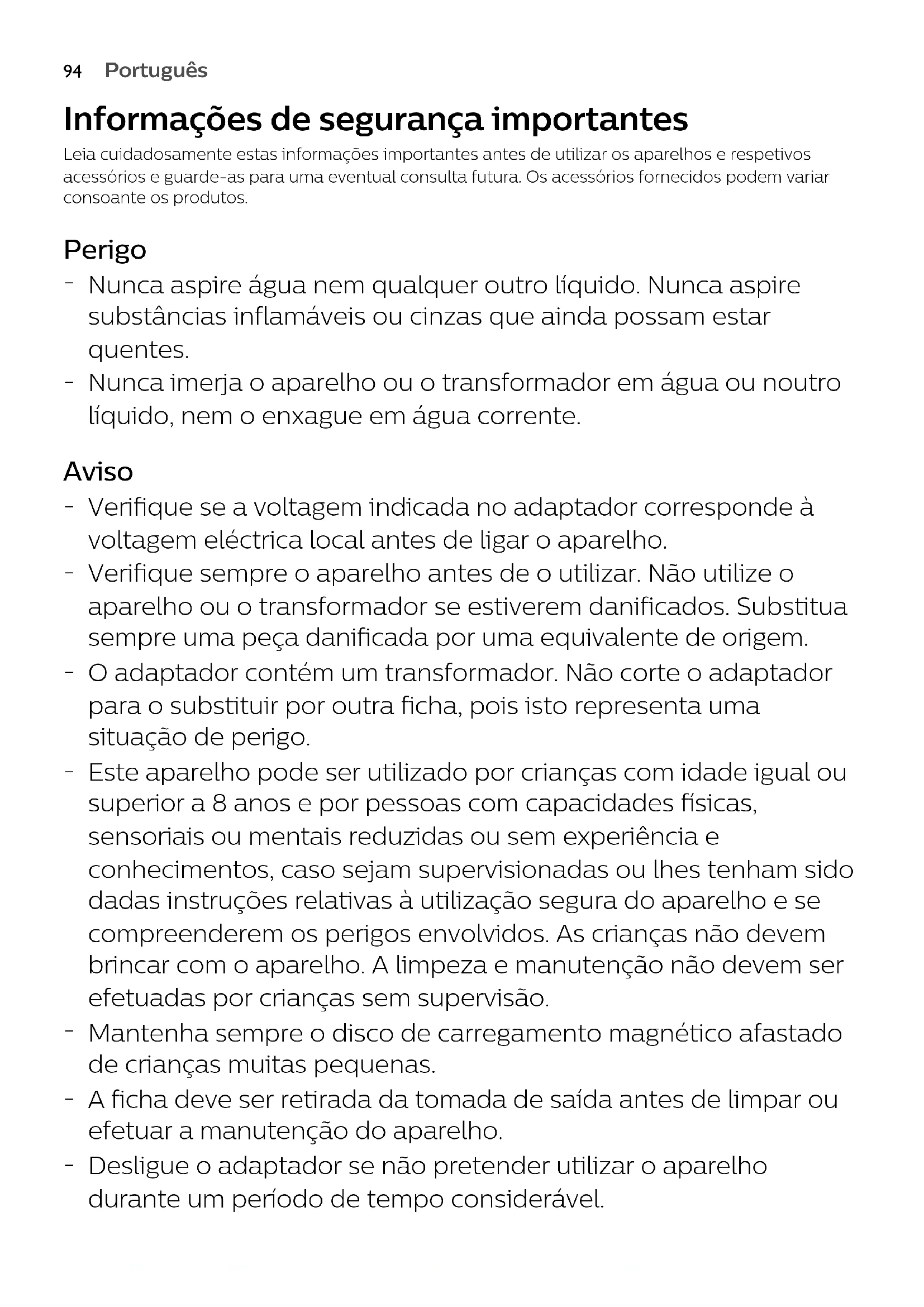 Nunca imerja o aparelho ou o transformador em água ou noutro líquido, nem o enxague em água corrente. Aviso