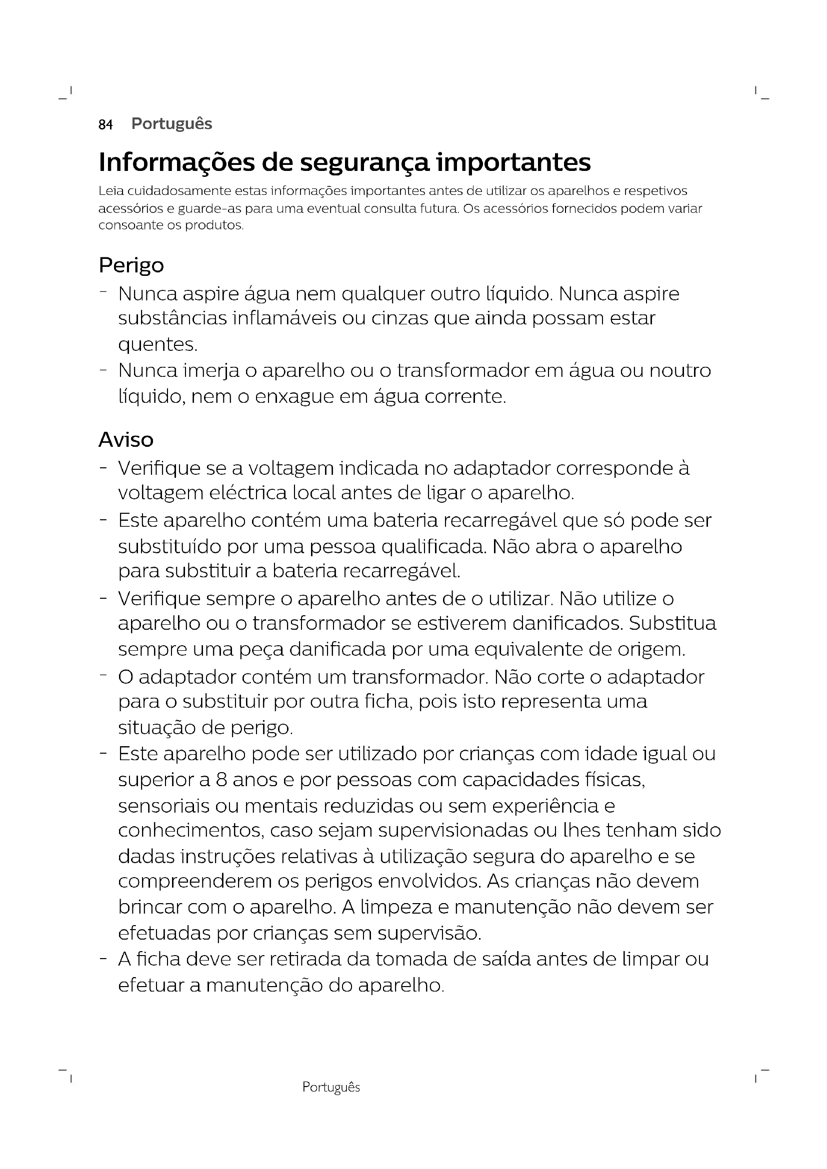 Nunca imerja o aparelho ou o transformador em água ou noutro líquido, nem o enxague em água corrente. Aviso