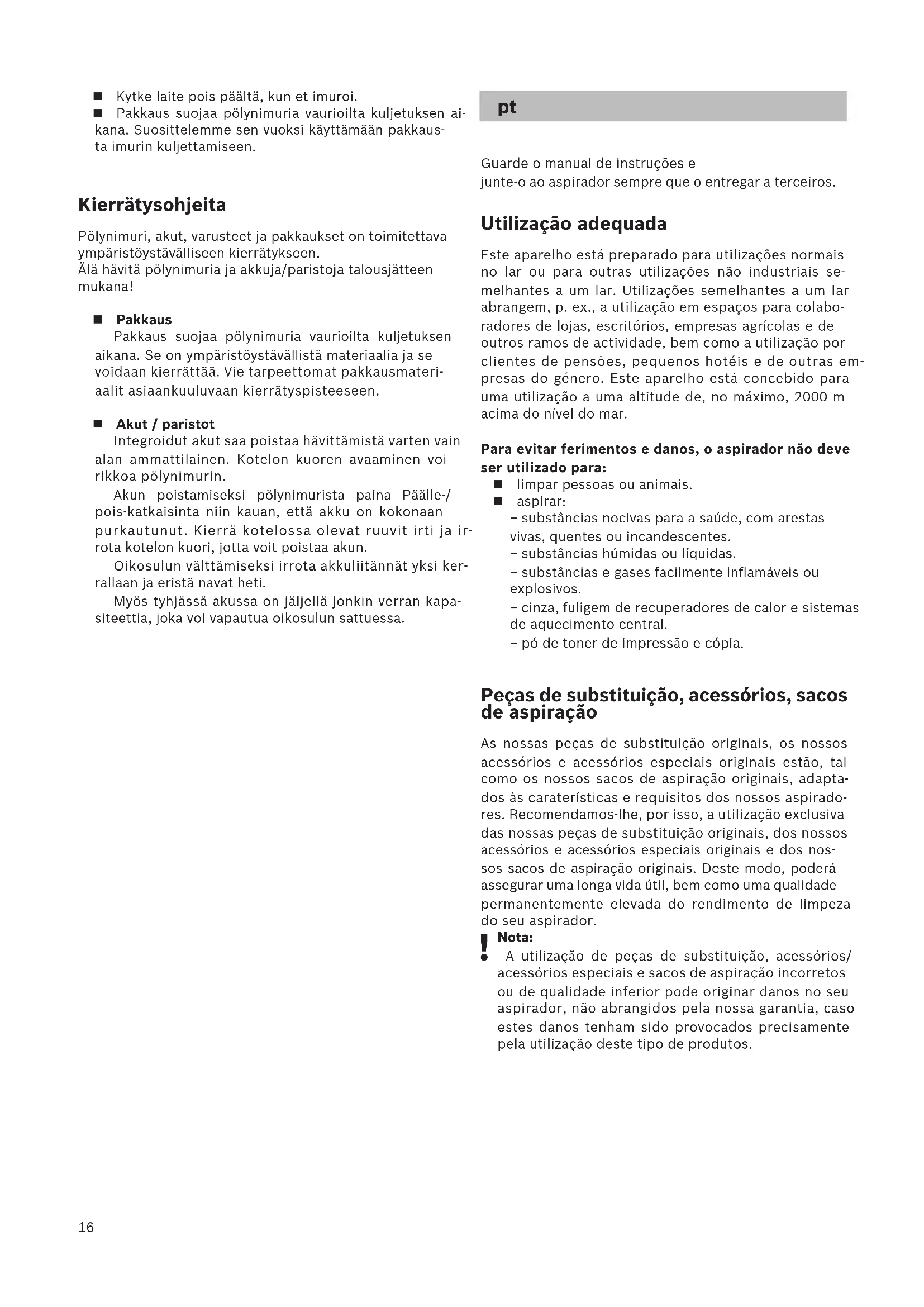 Nota: A utilização de peças de substituição, acessórios/ acessórios especiais e sacos de aspiração incorretos ou de qualidade inferior pode originar danos no seu aspirador, não abrangidos pela nossa garantia, caso estes danos tenham sido provocados precisamente pela utilização deste tipo de produtos. Kytke laite pois päältä, kun et imuroi. Pakkaus suojaa pölynimuria vaurioilta kuljetuksen ai- kana. Suosittelemme sen vuoksi käyttämään pakkaus- ta imurin kuljettamiseen. Kierrätysohjeita Pölynimuri, akut, varusteet ja pakkaukset on toimitettava ympäristöystävälliseen kierrätykseen. Älä hävitä pölynimuria ja akkuja/paristoja talousjätteen mukana! Pakkaus Pakkaus suojaa pölynimuria vaurioilta kuljetuksen aikana. Se on ympäristöystävällistä materiaalia ja se voidaan kierrättää. Vie tarpeettomat pakkausmateri- aalit asiaankuuluvaan kierrätyspisteeseen. Akut / paristot Integroidut akut saa poistaa hävittämistä varten vain alan ammattilainen. Kotelon kuoren avaaminen voi rikkoa pölynimurin. Akun poistamiseksi pölynimurista paina Päälle-/ pois-katkaisinta niin kauan, että akku on kokonaan purkautunut. Kierrä kotelossa olevat ruuvit irti ja ir- rota kotelon kuori, jotta voit poistaa akun. Oikosulun välttämiseksi irrota akkuliitännät yksi ker- rallaan ja eristä navat heti. Myös tyhjässä akussa on jäljellä jonkin verran kapa- siteettia, joka voi vapautua oikosulun sattuessa.17 Instruções de segurança Este aspirador está em confor- midade com as regras técnicas reconhecidas e cumpre as dis- posições de segurança aplicá- veis. Este aparelho não pode ser utilizado por crianças a partir dos 8 anos e pessoas com ca- pacidades físicas, sensoriais ou mentais reduzidas ou que não disponham de experiên- cia suficiente, excepto sob vigilância ou sob instruções específicas de utilização se- gura do aparelho, e desde que entendam os perigos re- sultantes da mesma. As crianças não podem brin- car com o aparelho. A limpeza e manutenção pelo utilizador não podem ser rea- lizadas por crianças sem su- pervisão. Os sacos de plástico e pelí- culas devem ser guardados e eliminados fora do alcance de crianças pequenas. >= Existe perigo de asfixia! Utilização correta Para carregar, utilize apenas o cabo de carregamento fornecido. Ligue o cabo de alimentação e coloque-o em funci- onamento apenas de acordo com a placa de carac- terísticas. Guarde e carregue o aparelho apenas em espaços in- teriores. Não exponha o aparelho a temperaturas inferiores a 0°C e superiores a 40°C. Nunca aspire sem que esteja colocado o saco de filtro, o recipiente de pó, a protecção do motor ou o filtro de saída do ar. >= O aparelho pode ser danificado! Evite aspirar com o bocal ou com o tubo em zonas próximas da cabeça. => Corre o perigo de se ferir! Não utilize o cabo de alimentação se este estiver da- nificado e substitua-o por um cabo de alimentação original. Para desligar o cabo de alimentação da corrente não puxar no fio de ligação, mas sim na tomada. Não deverá entalar o cabo de alimentação nem passá- lo sobre arestas vivas. Antes de realizar qualquer trabalho no aspirador, desligue o aparelho da corrente e do cabo de alimen- tação. Se o aspirador estiver danificado, não o coloque em funcionamento. Caso haja uma avaria, desligue o aparelho da corrente e do cabo de alimentação. Para evitar a ocorrência de danos, as reparações e a substituição de peças no aspirador só podem ser efe- tuadas pelo serviço de assistência técnica autorizado. Nos seguintes casos, o aparelho deve ser colocado imediatamente fora de serviço e o serviço de assistên- cia técnica contactado: − se tiver aspirado inadvertidamente líquido ou tiver entrado líquido para dentro do aparelho − se o aparelho tiver caído e estiver danificado. Proteja o aspirador de intempéries e mantenha-o afastado de fontes de humidade e de calor. Não aplicar substâncias inflamáveis ou com álcool nos filtros (sacos de filtro, filtros de proteção do motor, filtros de saída do ar, etc.). O aspirador não é adequado para ser utilizado em ob- ras de construção. => A aspiração de entulho pode danificar o aparelho. Desligue o aparelho quando não estiver a aspirar. A embalagem protege o aspirador contra danos duran- te o transporte. Por isso, recomendamos que guarde a embalagem para fins de transporte. Indicações sobre a eliminação Aspiradores, baterias, acessórios e embalagens devem ser sempre entregues num centro de reciclagem ambien- talmente responsável. Não deite aspiradores nem baterias/pilhas para o lixo doméstico! Embalagem A embalagem protege o aspirador contra danos du- rante o transporte. É composta por materiais amigos do ambiente, sendo, por isso, reciclável. Coloque os materiais de embalagem de que já não precisa nos ecopontos. Baterias / Pilhas As baterias integradas só podem ser retiradas para eliminação por pessoal técnico qualificado. A abertu- ra do alojamento da caixa pode destruir o aspirador. Para retirar a bateria do aspirador, acione o botão para ligar/desligar até a bateria estar completamente descarregada. Desaperte os parafusos na caixa e re- mova a o alojamento da caixa, para retirar a bateria. Para evitar um curto-circuito, separe individualmente as ligações na bateria e, em seguida, isole imediata- mente os polos. Mesmo após um descarregamento completo, a bate- ria ainda contém capacidade residual que pode ser libertada, em caso de curto-circuito.18