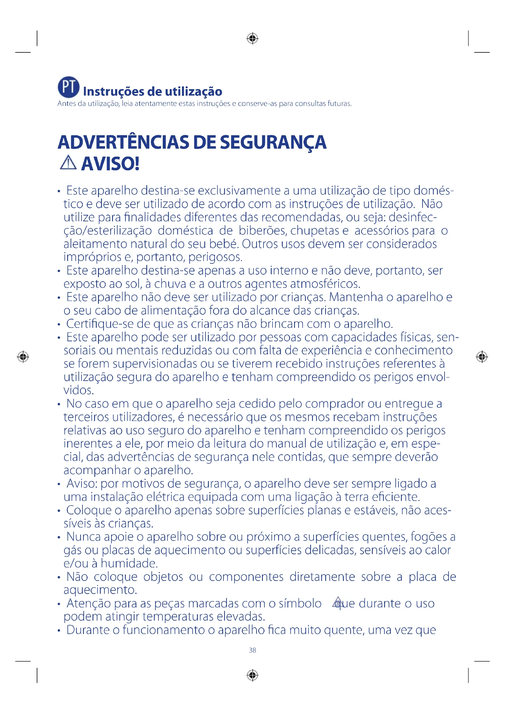- Este aparelho destina-se exclusivamente a uma utilização de tipo domés- tico e deve ser utilizado de acordo com as instruções de utilização. Não utilize para nalidades diferentes das recomendadas, ou seja: desinfec- ção/esterilização doméstica de biberões, chupetas e acessórios para o aleitamento natural do seu bebé. Outros usos devem ser considerados impróprios e, portanto, perigosos.