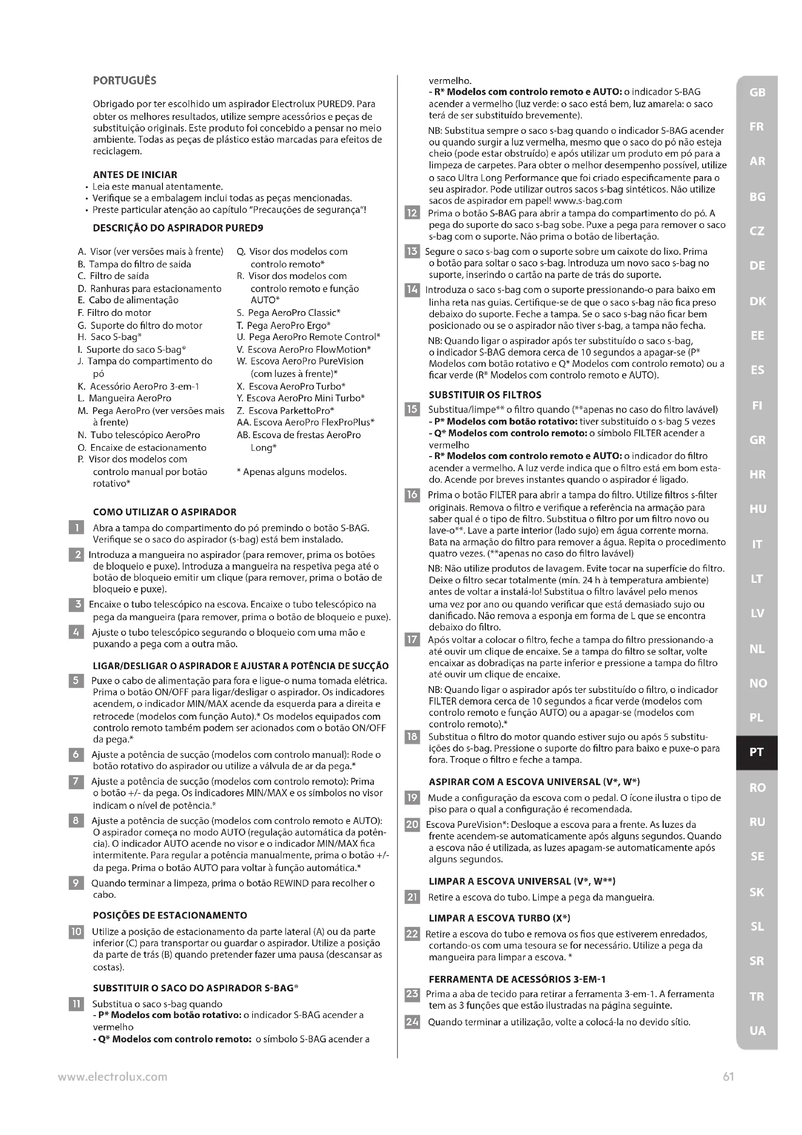 UAPORTUGUÊS Obrigado por ter escolhido um aspirador Electrolux PURED9. Para obter os melhores resultados, utilize sempre acessórios e peças de substituição originais. Este produto foi concebido a pensar no meio ambiente. Todas as peças de plástico estão marcadas para efeitos de reciclagem.