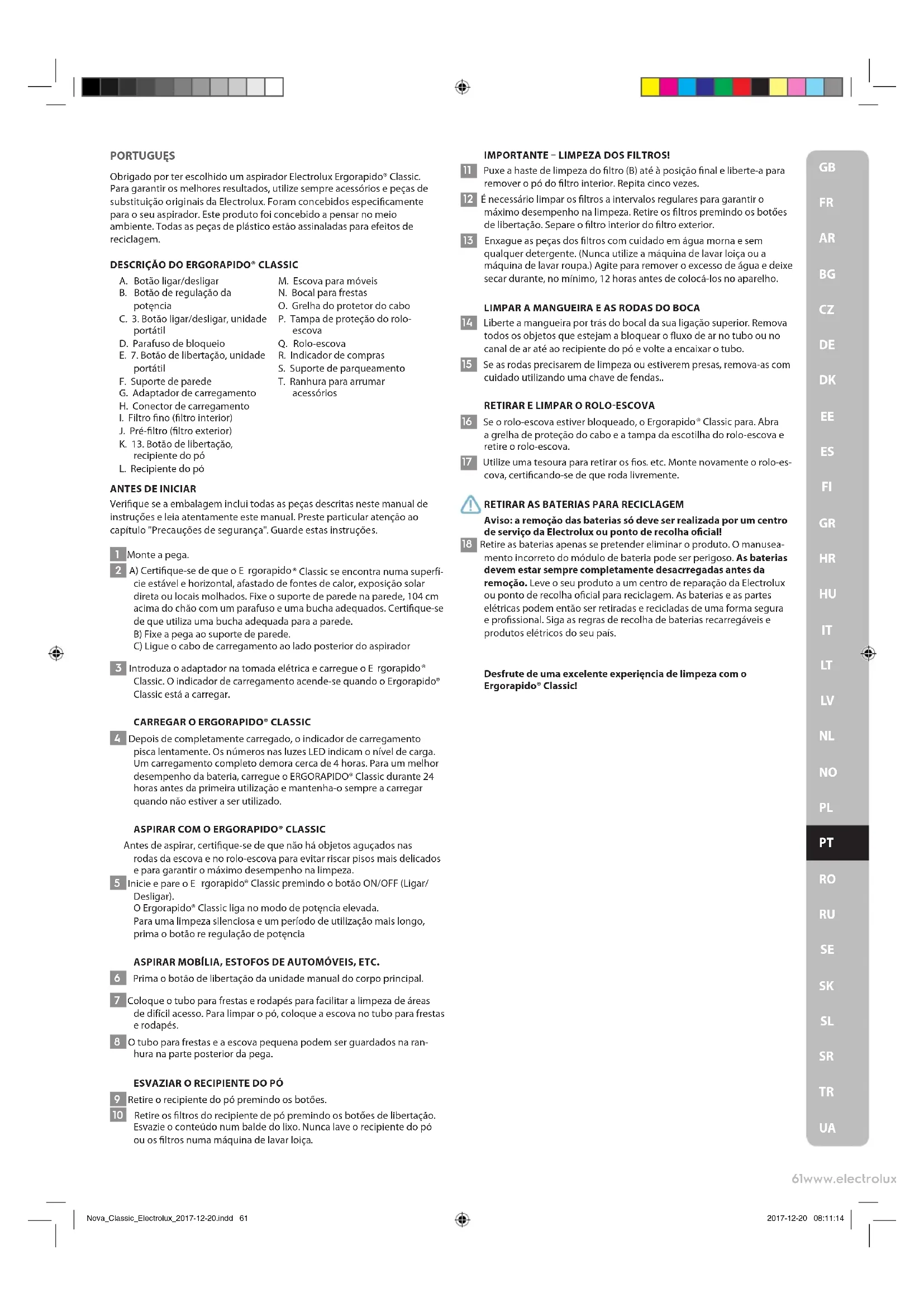Aviso: a remoçăo das baterias só deve ser realizada por um centro de serviço da Electrolux ou ponto de recolha ocial! 18 Retire as baterias apenas se pretender eliminar o produto. O manusea- mento incorreto do módulo de bateria pode ser perigoso. As baterias devem estar sempre completamente desacrregadas antes da remoçăo. Leve o seu produto a um centro de reparaçăo da Electrolux ou ponto de recolha ocial para reciclagem. As baterias e as partes elétricas podem entăo ser retiradas e recicladas de uma forma segura e prossional. Siga as regras de recolha de baterias recarregáveis e produtos elétricos do seu país. Desfrute de uma excelente experięncia de limpeza com o Ergorapido® Classic! Nova_Classic_Electrolux_2017-12-20.indd 61 2017-12-20 08:11:14LUZES INDICADORAS CARREGAMENTO O QUE SIGNIFICA? DURANTE A UTILIZAÇĂ O QUE SIGNIFICA? Intermitęncia lenta = 100 % totalmente carregado